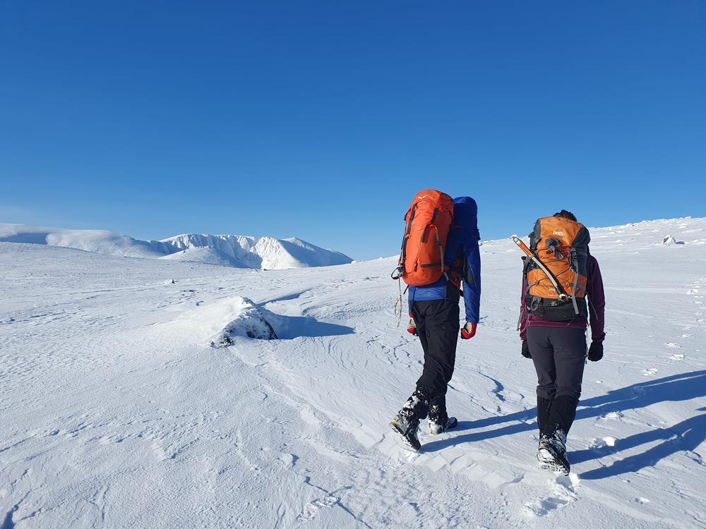 On Friday, Allan and Kate enjoyed the little Creag Choinnich outside Braemar on the way to the meet. Steve and Martha picked Gill up from the Fife Arms and headed to Morven. Gill only realised halfway down the road that Martha and Steven had planned to climb the Morven north of Ballater, rather than the one south of Braemar, but as Gill hadn’t yet been up either, no harm was done. They had a fabulous day in the snow with sunshine and blue skies for most of the day; solid névé alternating with some drifting powder – a perfect birthday present for Martha from the Universe. On the way down they met a solo walker who was crawling up the hill – wearing plimsolls and without axe, crampons or microspikes. He ensured them he was fine and answered the question for his plans to get down the hill: “I’ll just slide down on my bum!”.