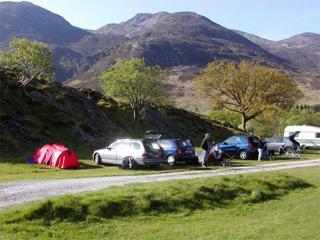 This was a new campsite for the club, set peacefully on the south shores of Loch Leven, and about equidistant from Glencoe village and Kinlochleven. A hastily arranged change from the scheduled camping meet, (Loch Morlich was closed for refurbishment) it proved to be a good replacement choice, with more than adequate facilities, and very reasonably priced. Nine club members attended the weekend, with those who arrived early providing an aperitif for the first midges of the summer season. Midge nets and insect repellent worked OK but we decided to visit the pub in Glencoe anyway, with Anne C kindly offering to drive us in her new 4*4. On our return the others were enjoying a beer or three ‘al fresco’ in the evening shadows of the Mamore hills and Kenny and Alison C’s new dome tent, named Binnein Mor.
