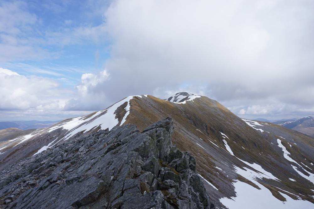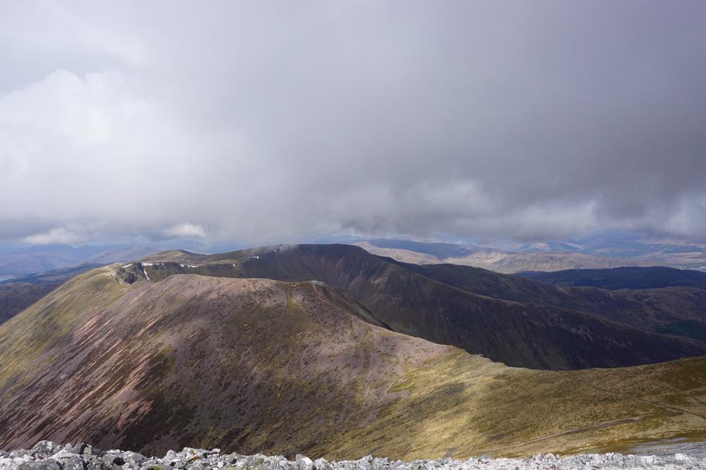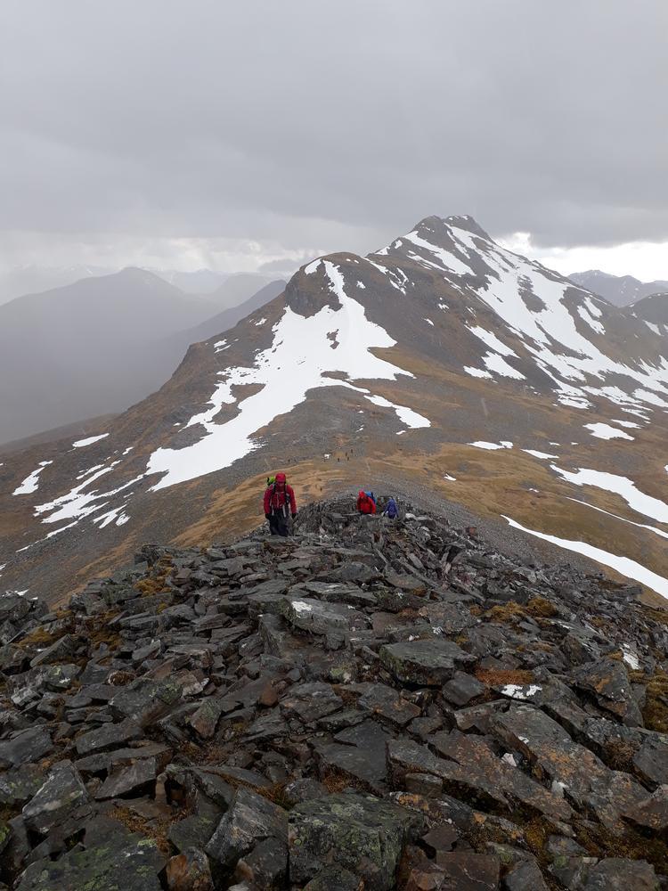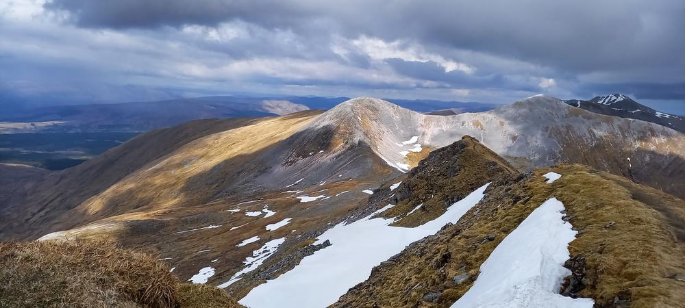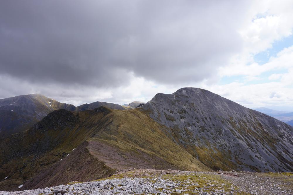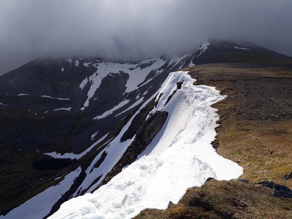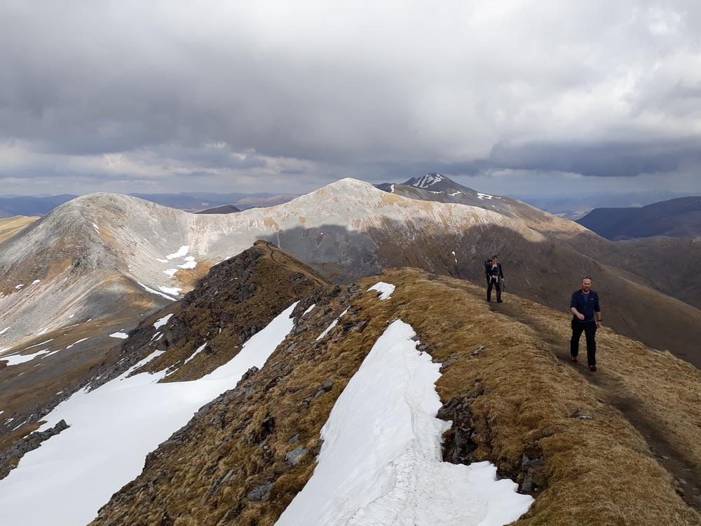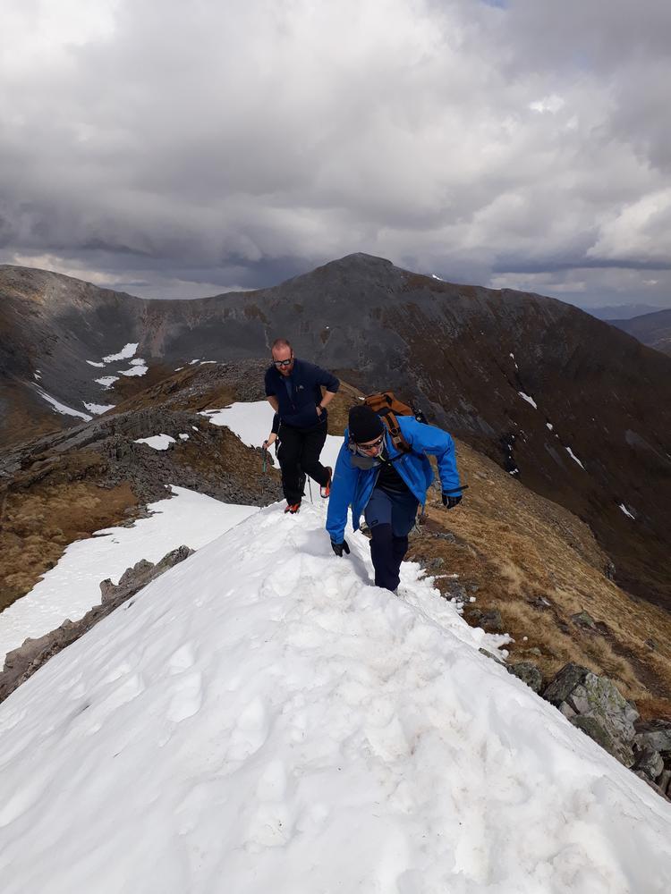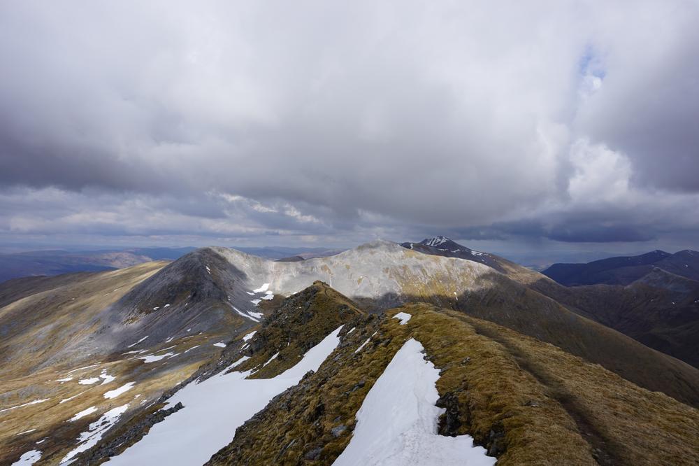 Myself, Chris, Martha, Enguerrand and Kamila made up the advance Grey Corries group while Pauline and Dave leapfrogged a large group of blokes who were also out on the popular ridge that day. Enguerrand joined me for the Munro Top outlier of Stob Coire Claurigh – a lovely scramble – and we tottered along the partly snowy ridge, eventually catching the rest of the group again at Stob Coire an Laoigh for belated lunch. We crossed over to Sgurr Choinnich Mor and I nipped out to the other outlying Munro Top – Sgurr Choinnich Beag. We enjoyed some superb bum-sliding en route back to the main ridge before the heavens opened but it wasn’t a bad dousing.