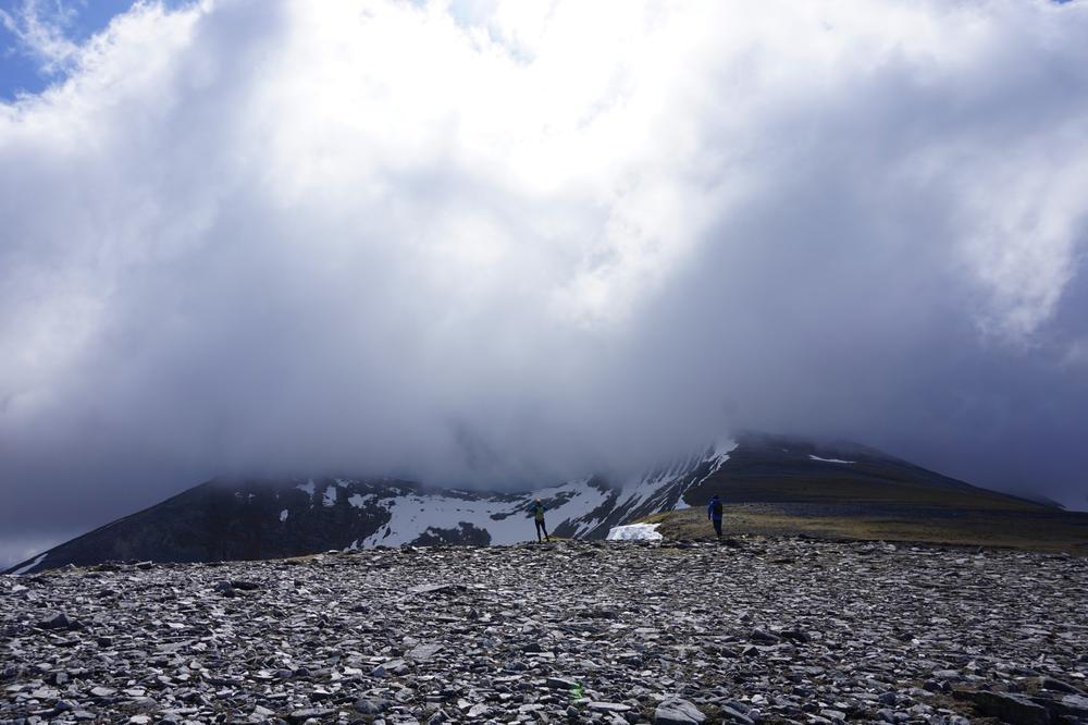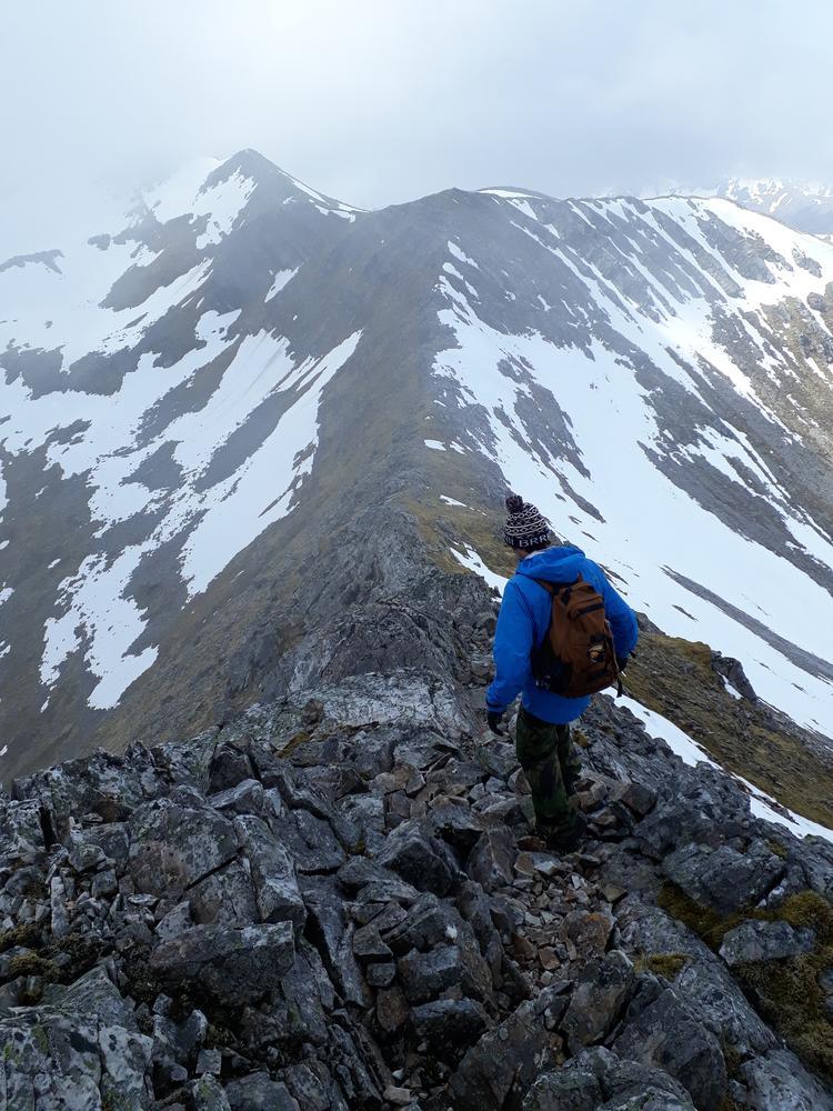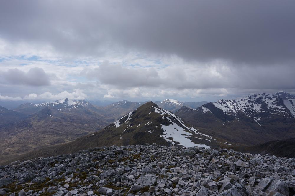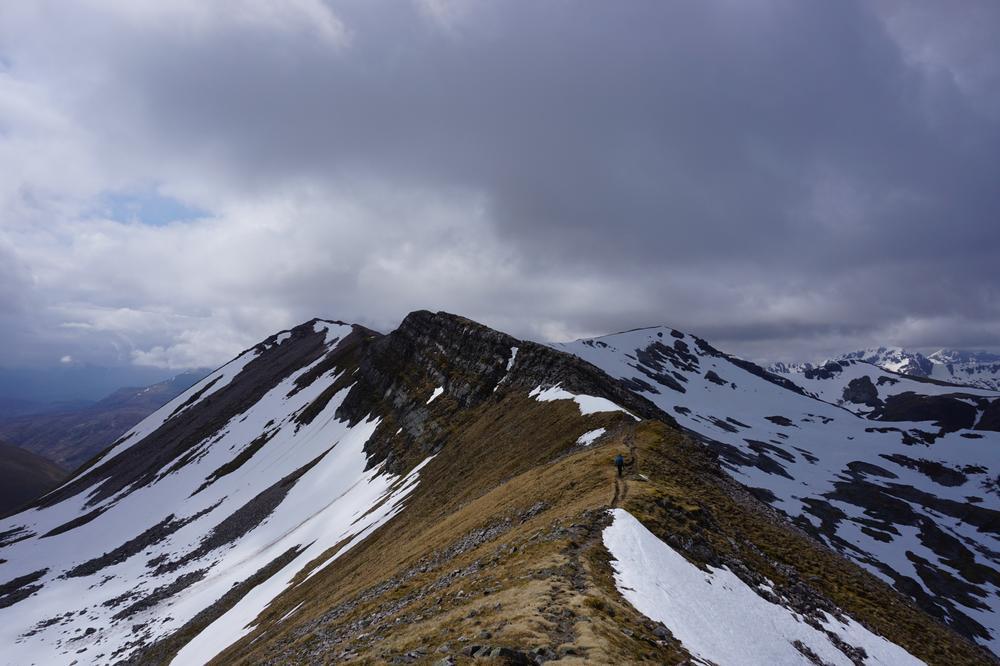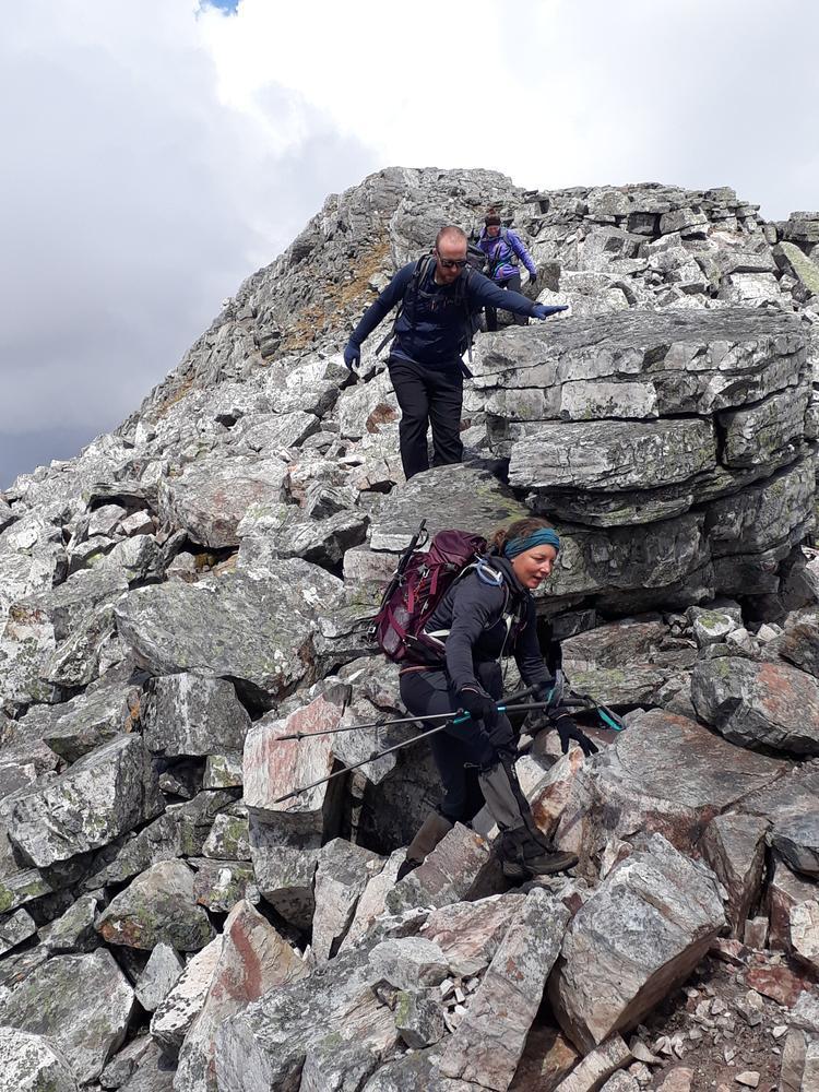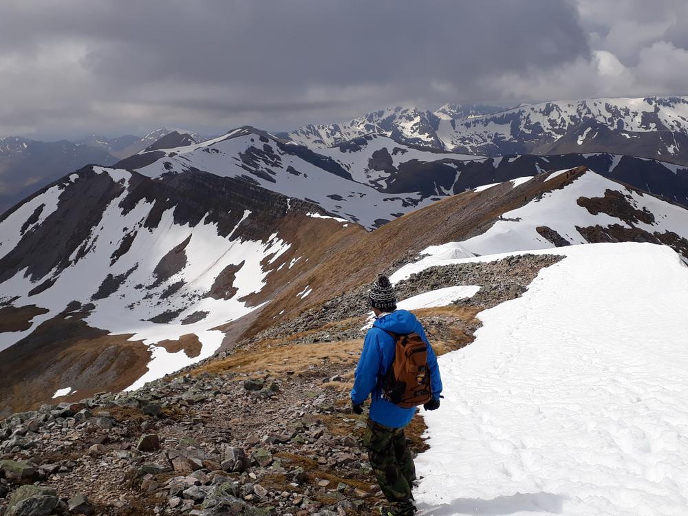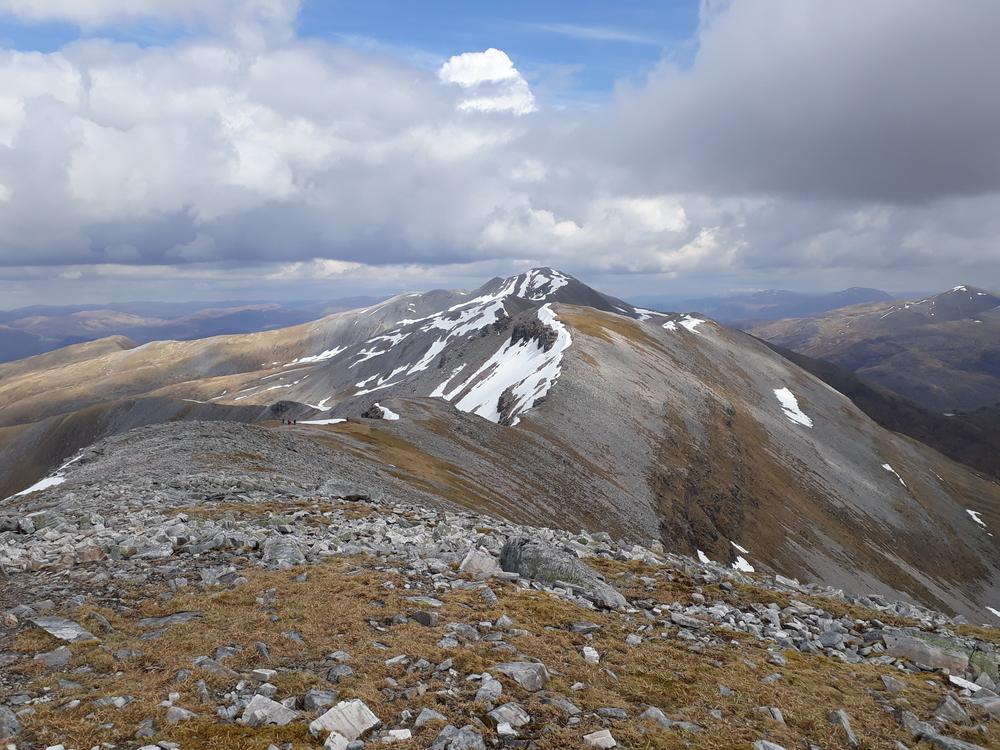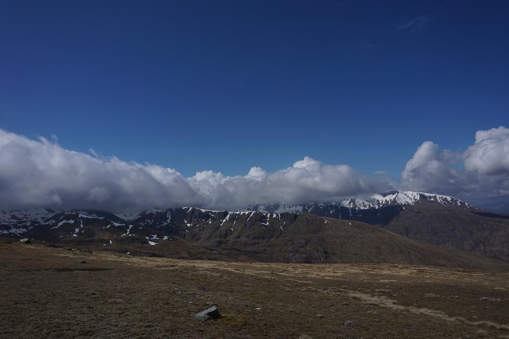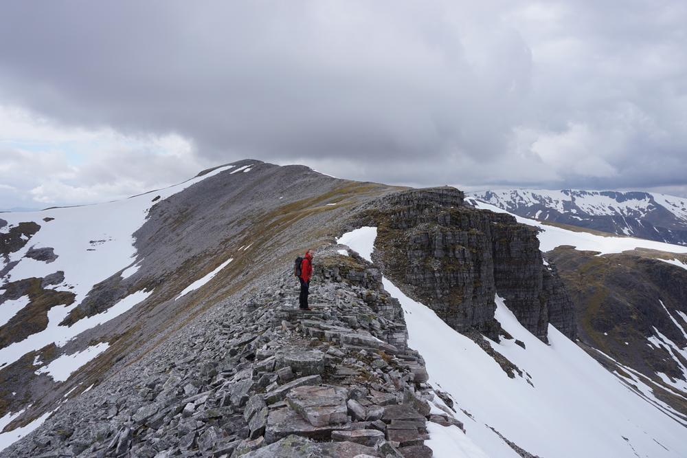 Myself, Chris, Martha, Enguerrand and Kamila made up the advance Grey Corries group while Pauline and Dave leapfrogged a large group of blokes who were also out on the popular ridge that day. Enguerrand joined me for the Munro Top outlier of Stob Coire Claurigh – a lovely scramble – and we tottered along the partly snowy ridge, eventually catching the rest of the group again at Stob Coire an Laoigh for belated lunch. We crossed over to Sgurr Choinnich Mor and I nipped out to the other outlying Munro Top – Sgurr Choinnich Beag. We enjoyed some superb bum-sliding en route back to the main ridge before the heavens opened but it wasn’t a bad dousing.