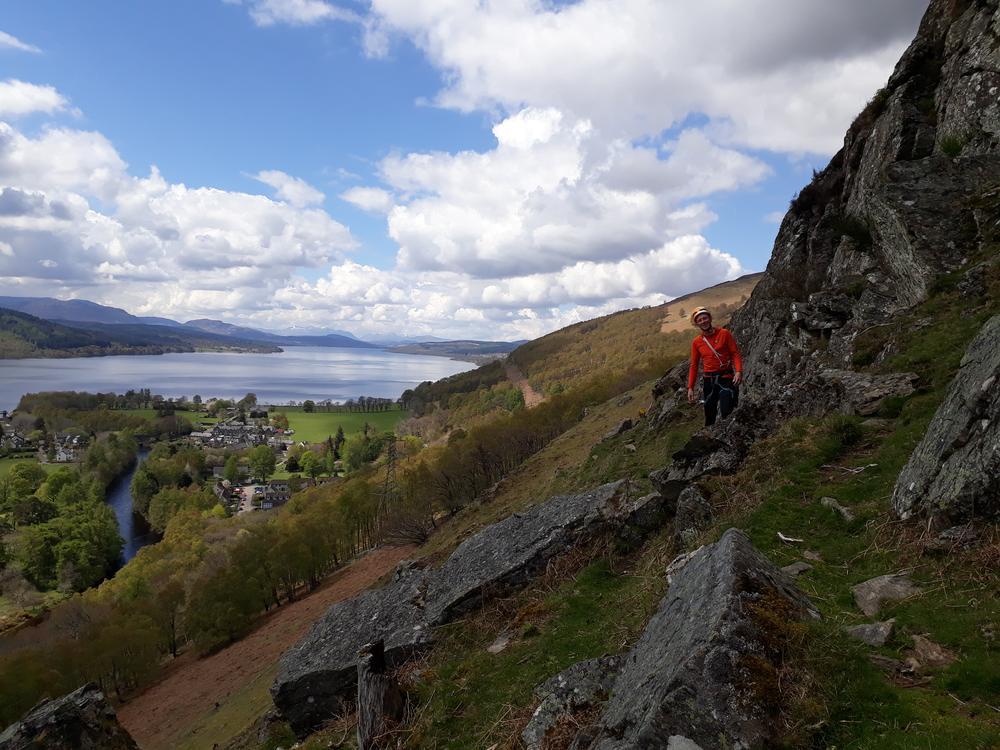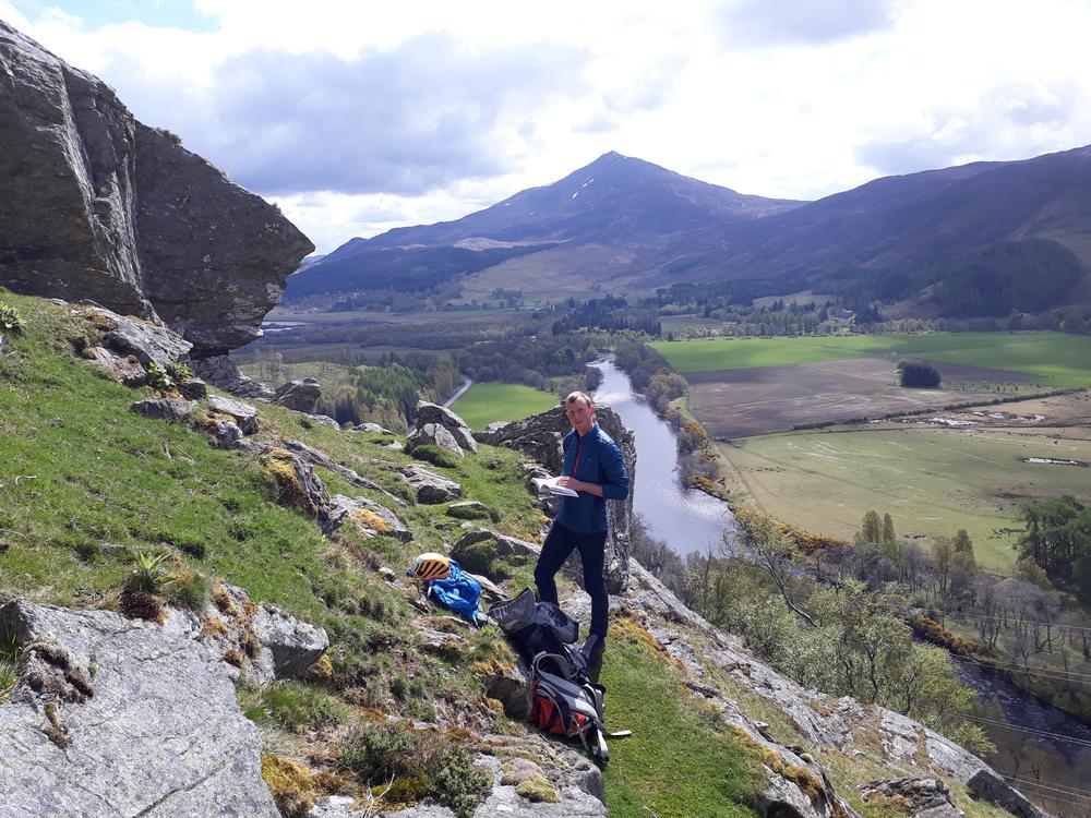 On the Sunday Martha bagged her Munros 6 and 7 of the weekend on Stob Ban and Mullach nan Coirean, Chris Re left early in the morning to climb Beinn Fionnlaidh. David T headed up a Graham whose name roughly translates from Gaelic as “rough knob” or similar. Neil and I did some chilled out climbing at Craig Varr near Kinloch Rannoch on our way back down the road and got climbers’ tan which was unexpected! T’other Clare and Chris Wo went up the Beinn a Chlachair trio and Enguerrand headed for a run up to the CIC. Nigel climbed another 500m+ Marilyn Doire Ban which is sandwiched between the Mamores and Glencoe; Fiona and Mike went to Glenfinnan to do the horseshoe parking at Mike’s colleague’s place for the cold beer he’d promised Mike (Fiona was on coffee) and also to gather photographic evidence he still exists.