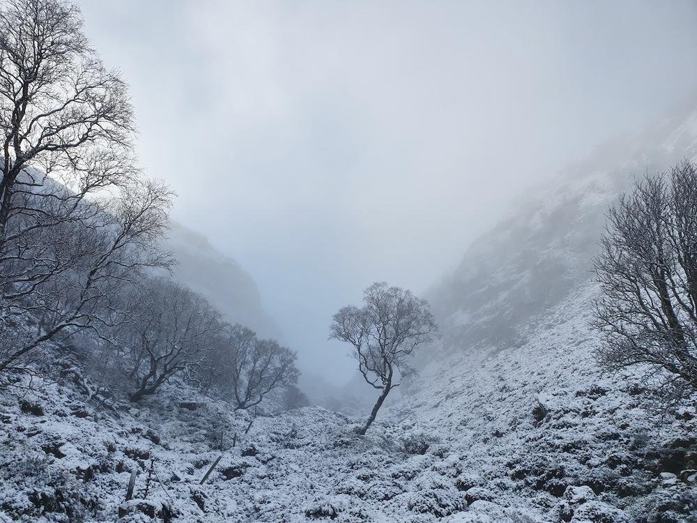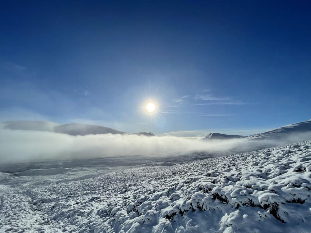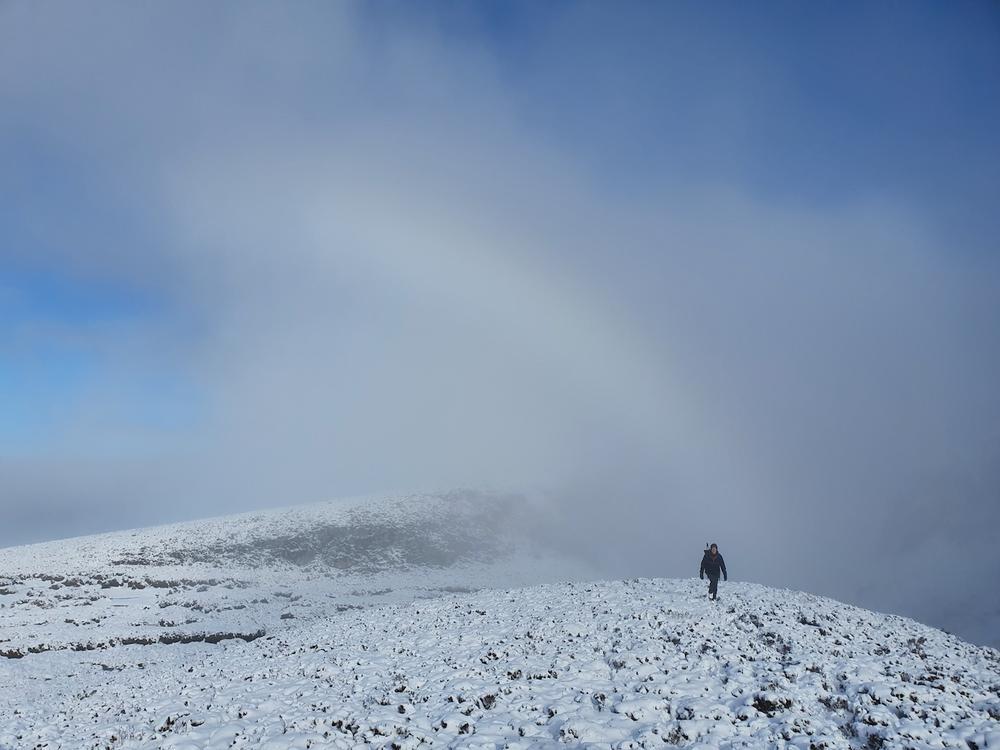 Saturday morning brought fresh snow and we awoke to a winter wonderland. Plans were rapidly finalised. Martha, Keith, Dan, Duncan, Tim N, Fiona C, Alison C, Gillian and Gill headed for the Fara via Dirc Mhor – some on foot along the road and others parked a bit closer. Mostly it was described as atmospheric with swirling clouds and the unusual and impressive Dirc Mhor gorge to contend with. Kenny met them on the top having taken the less dramatic route of ascent and his footsteps were duly followed by the party of 10 on the way down.