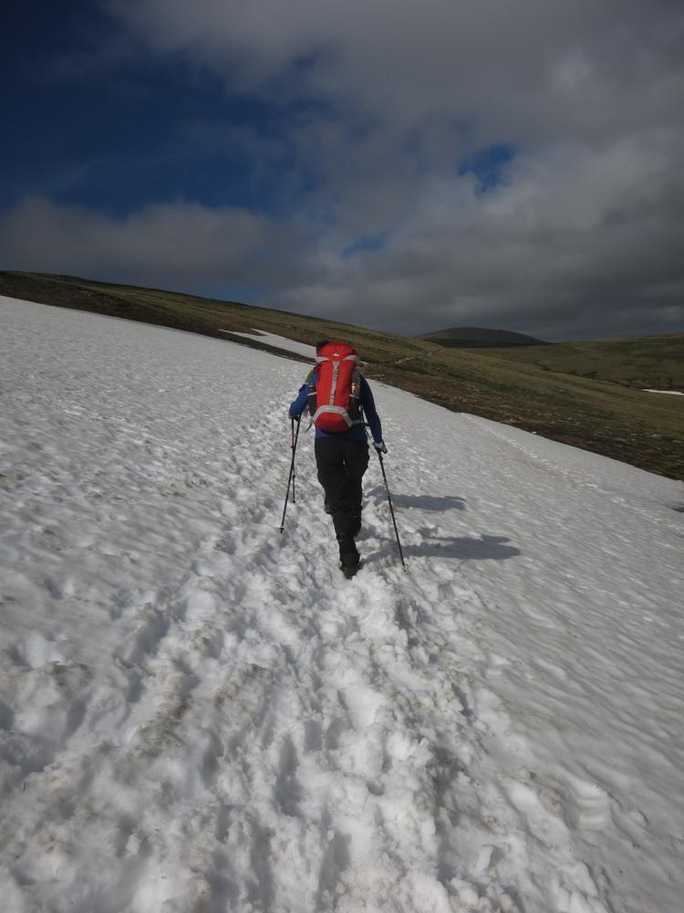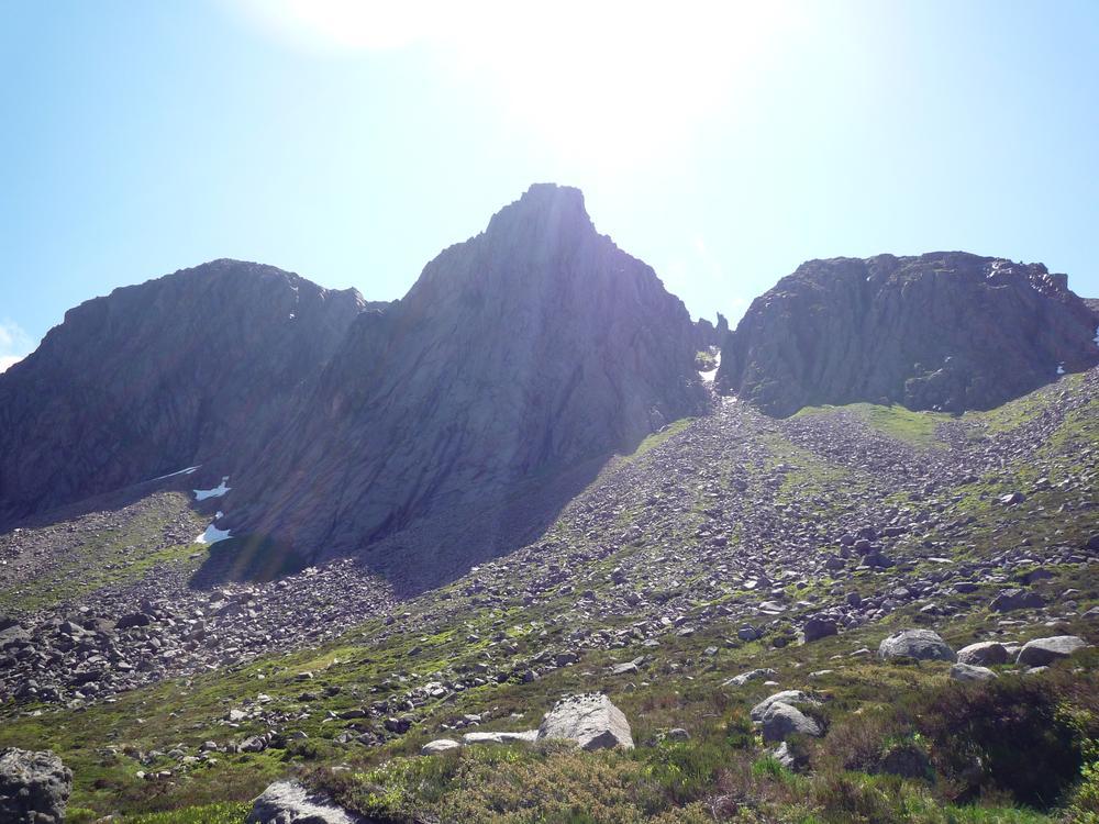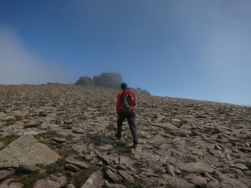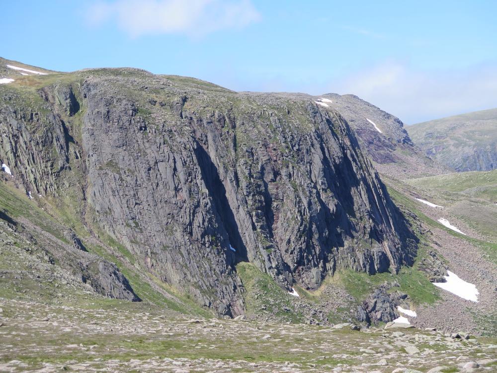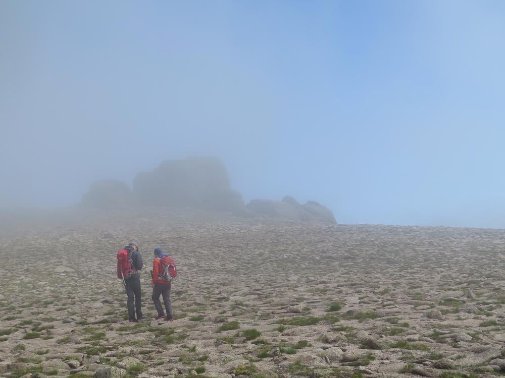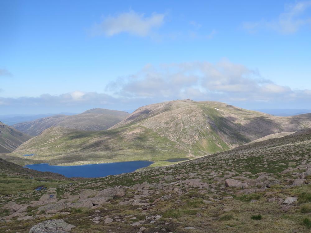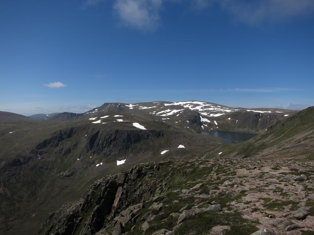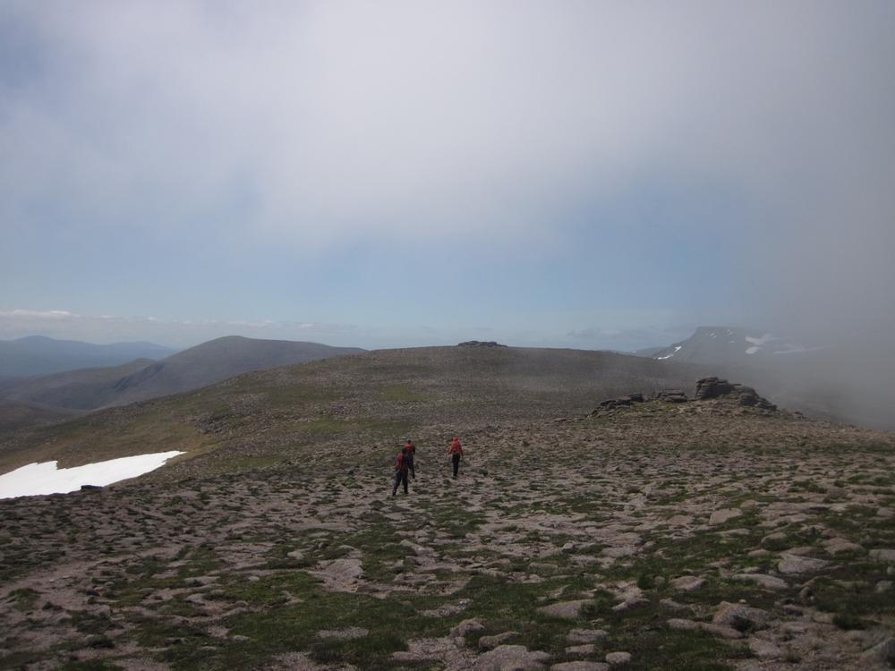 Alison, Emma, Mike and Fiona went off on a combined Munro and top bagging mission with Emma starting the day expecting to do one maybe two Munros but ending up doing 3 Munros and 3 tops, oops! We ascended to the plateau via the Goat Track into the clag hoping that the forecast was correct as we headed down Coire Domhain on a compass bearing. Thankfully by the time we were on the first top, Stacan Dubh the mist was starting to clear and by the time we got to Beinn Mheadhoin it had turned into a pretty glorious day. After the third top the party started to split into parts to tag various tops and summits meeting up again at the “obvious boulder” near Creagan a’ Choire Etchachan. At that point Fiona headed on a solo mission to Carn Etchachan with the others heading back over Ben Macdui. On route to Carn Etchachan Fiona narrowly missed Kenny and Alan who’d attempted two different scrambles finding one to be soaking wet and the other covered in snow, in June!!!