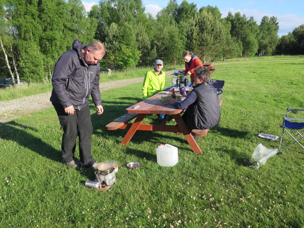 Saturday night was sociable, sunny and almost midge free so everyone sat outside and cooked/ate dinner on a picnic bench which moved rather alarmingly when someone got up / sat down. Kenny tried tightening the bolts with a spanner which improved things slightly but it was still worth holding onto your beer/ dinner just in case! The midge eventually said hello about 10pm and with various folks quite tired from the days exertion sleeping bags were crawled into.