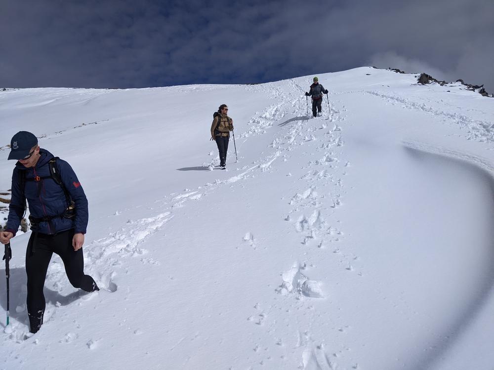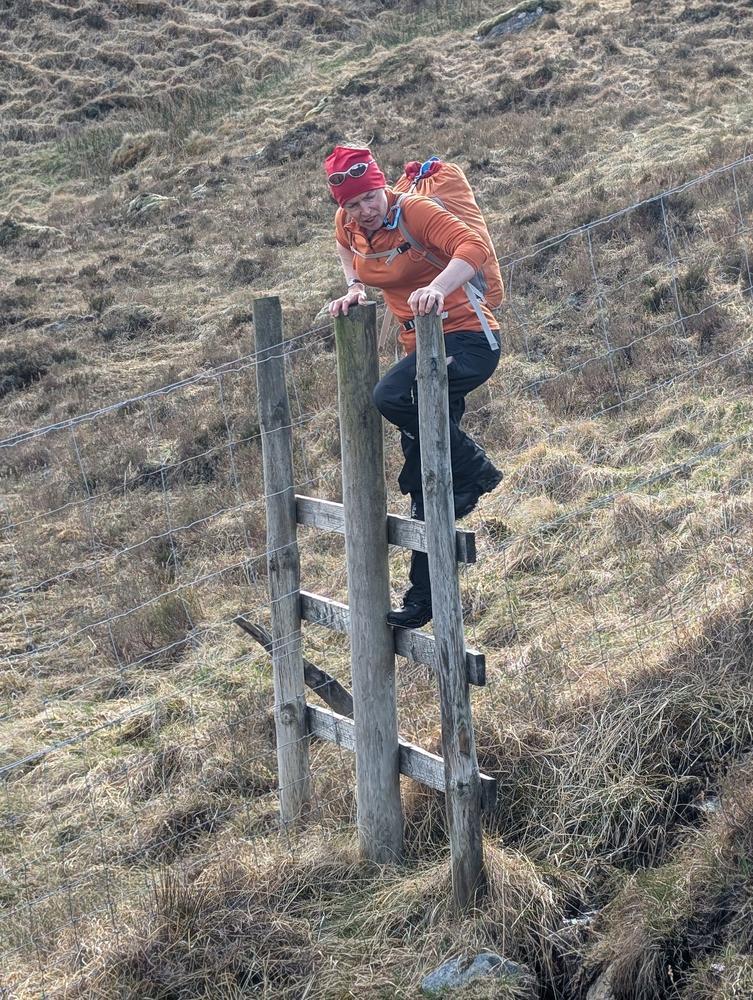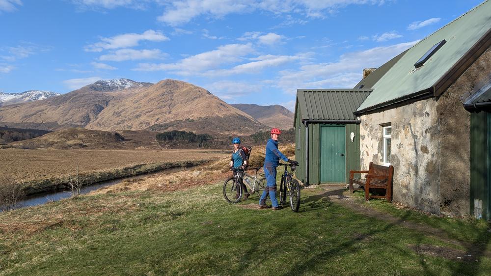 Fiona & Mike were just around the corner on the Strathfarrar Munros. Great weather, views and very little snow made for quick progress. On returning to the car a weather check revealed that Saturday’s weather was no longer looking “peachy” and that the weather front was fast approaching so getting to Strawberry Cottage ASAP to avoid a dousing became a priority. They met Steve and Martha in the car park where the interestingly bike-in-ready packed apple crumble was popped into Steve’s car, and managed to get to the cottage before the rain.