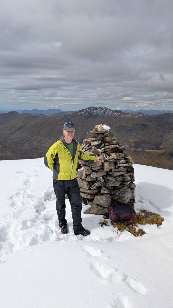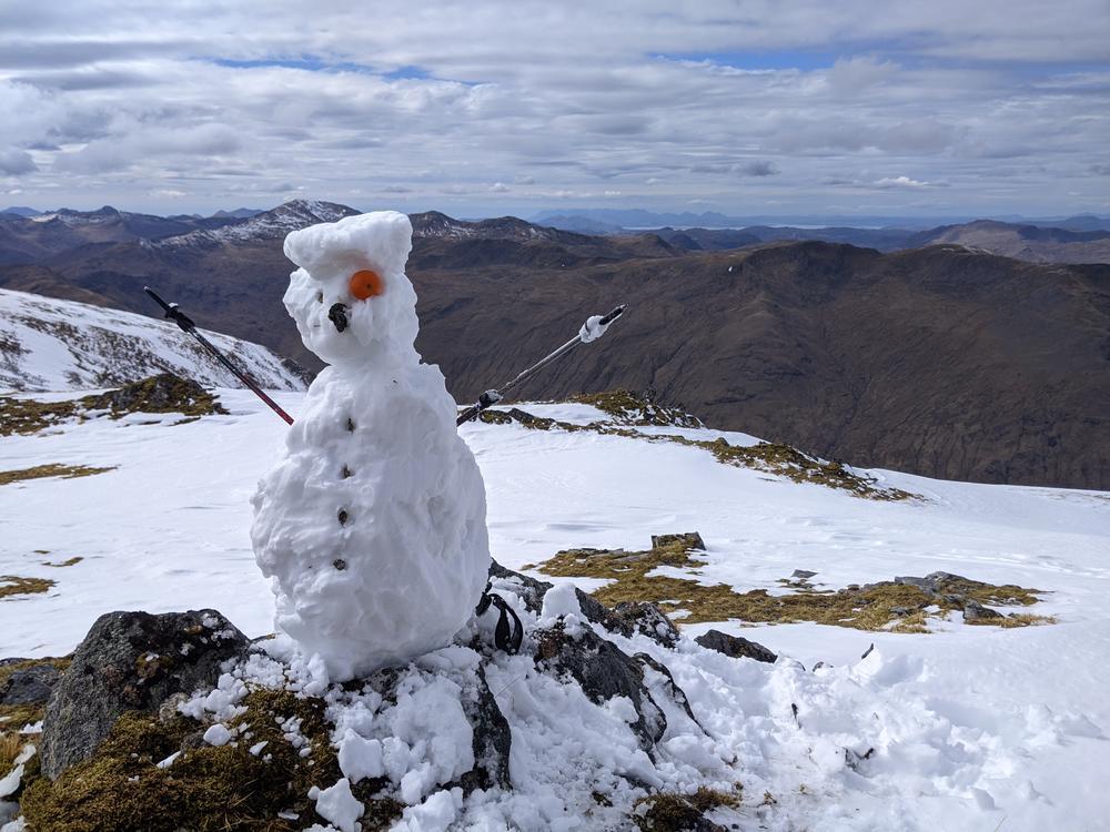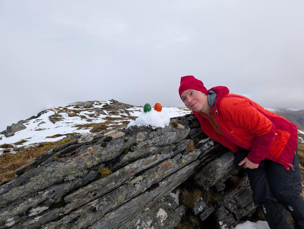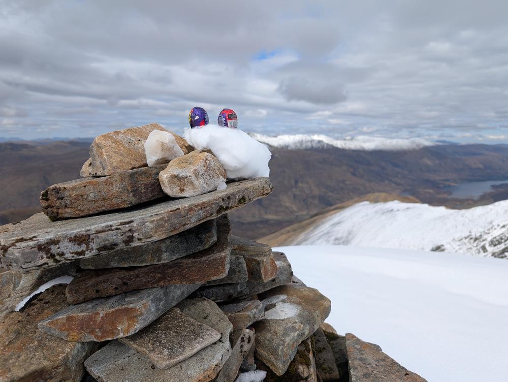 Sunday was glorious – although the amount of snow on the tops made for hard going in parts. Mike and Fiona did the round of Sail Chaorainn, Sgurr nan Conbhairean, A’Chraiaig and Mullach Fraoch-choire. Martha’s wonderful coloured eggs were consumed and photographed on the first summit with Steve’s chocolate eggs on the final summit. The day was only spoiled by the “path” or lack thereof for the last 60 minutes that seemed to take forever.