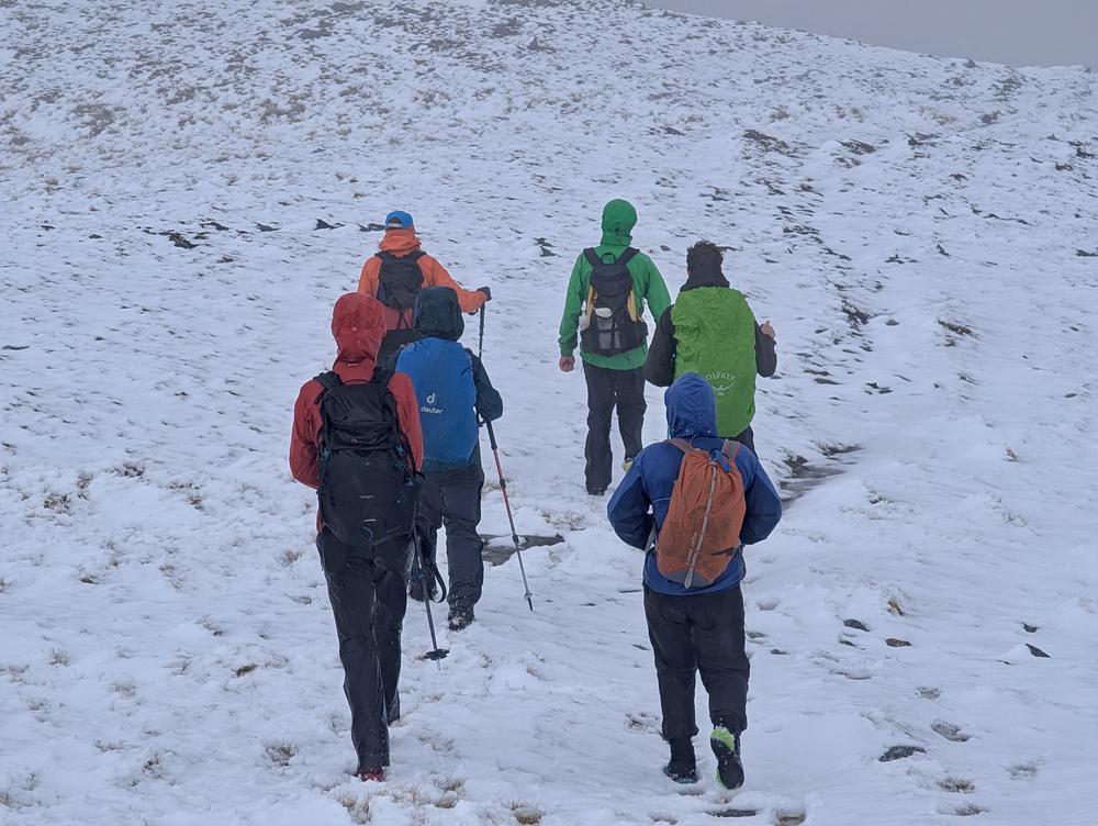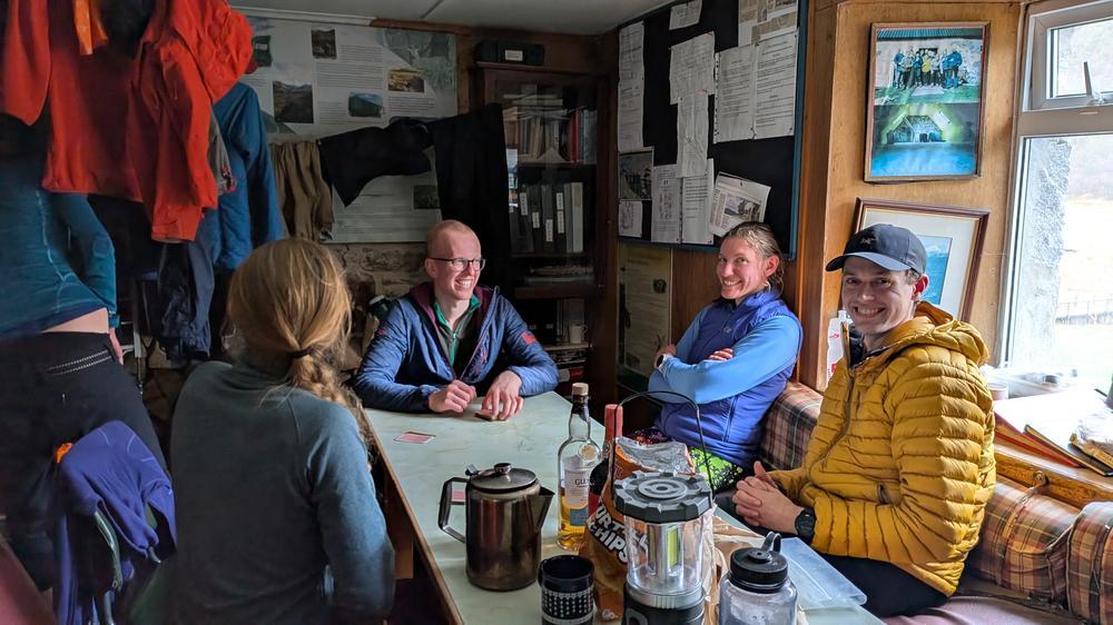 Helen, Rhi, Doug, Iain, Mike, Fiona and Anna played cards, drank tea and avoided going outside until just before noon. They then headed up An Socach where they bumped into Gillian on the snow-covered summit.