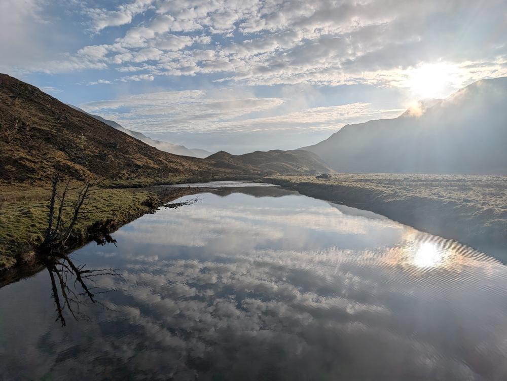 2 laden kayaks and a canoe set off from Loch Beinn a Mheadoin and sailed down Loch Affric, propelled by a camping tarp, transporting Doug, Rhi, Anna & Steve M. Shallow waters and raging waterfalls got in the way at the end, so their final approach was on foot. Doug forgot his waterproof and was rescued by Perry’s spare. Thanks Perry!