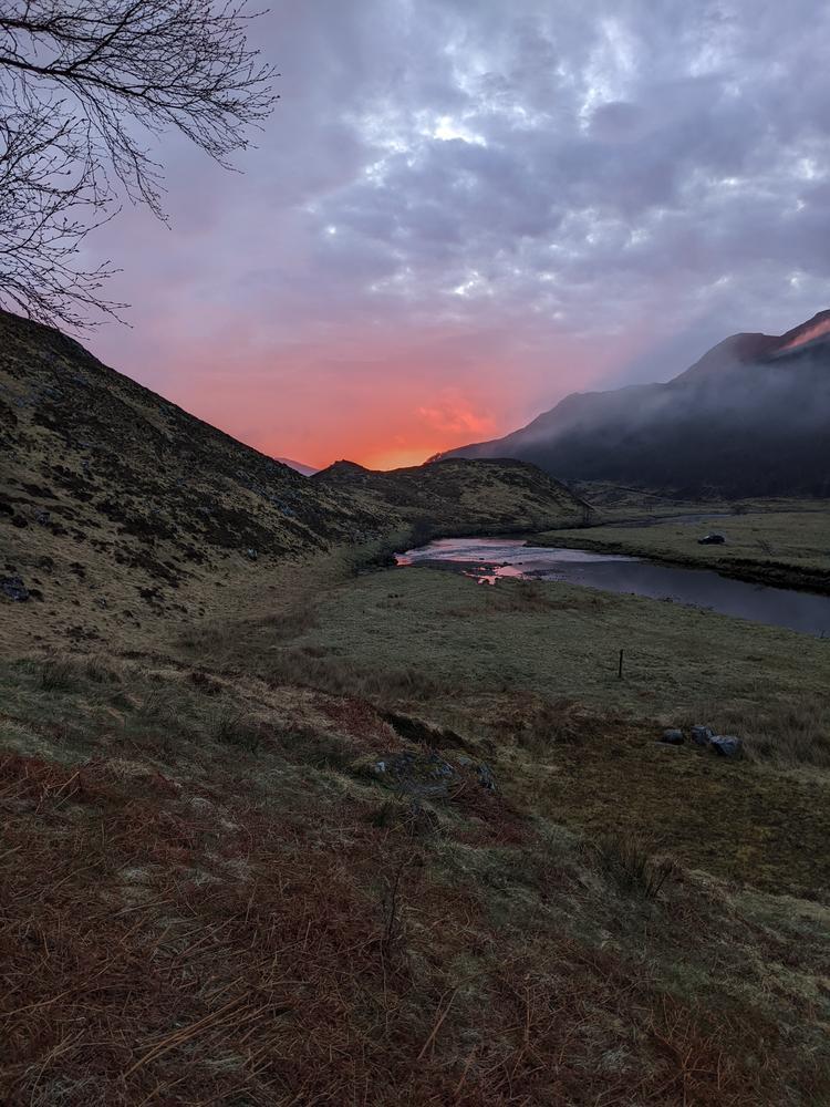 Ash and Lianne who were staying at Cannich had jogged to the Cottage, arriving absolutely soaked and a bit chilled. After a hot cup of tea they set off with Claire and myself for a Munro-top & Corbett bagging mission, but turned around when it became apparent that conditions higher up were too wintry for the supplies they had brought along. Claire and I carried on with our loop over Carn na Coire Mheadhoin, Tigh Mor Na Seilge and Carn a’ Choire Ghairb – low vis, quite a bit of of snow, cold feet in trainers!