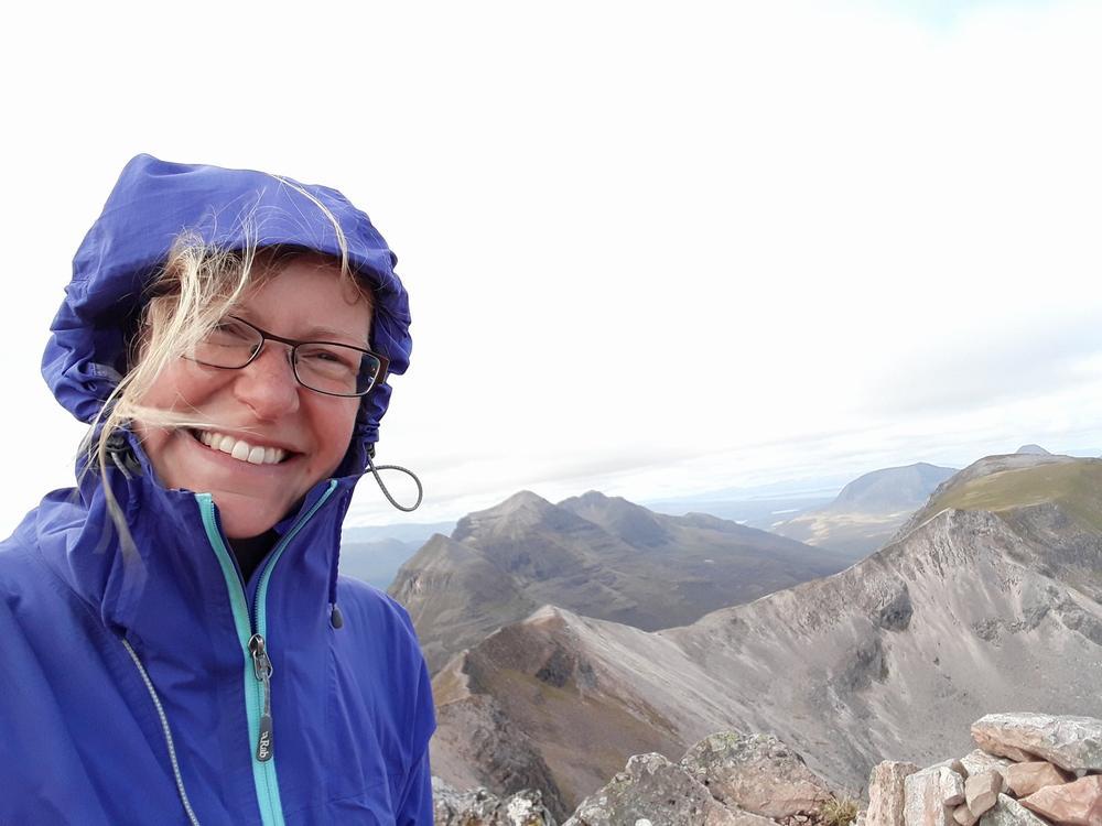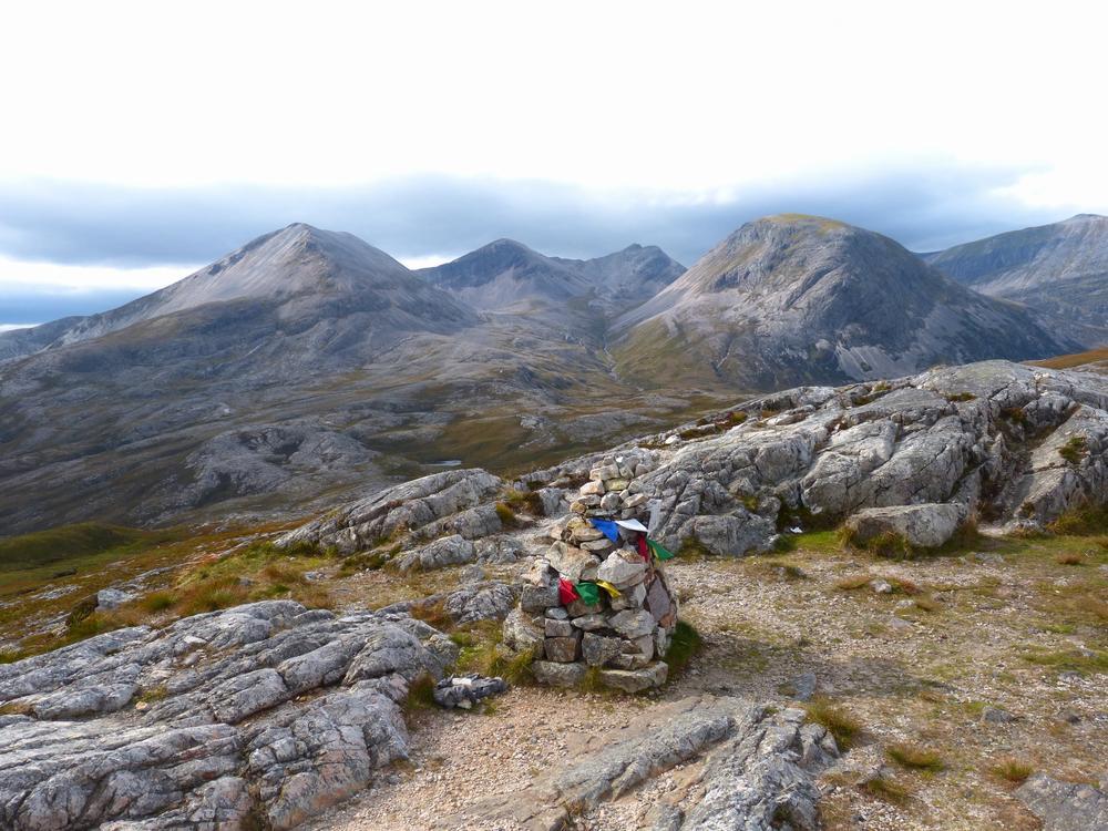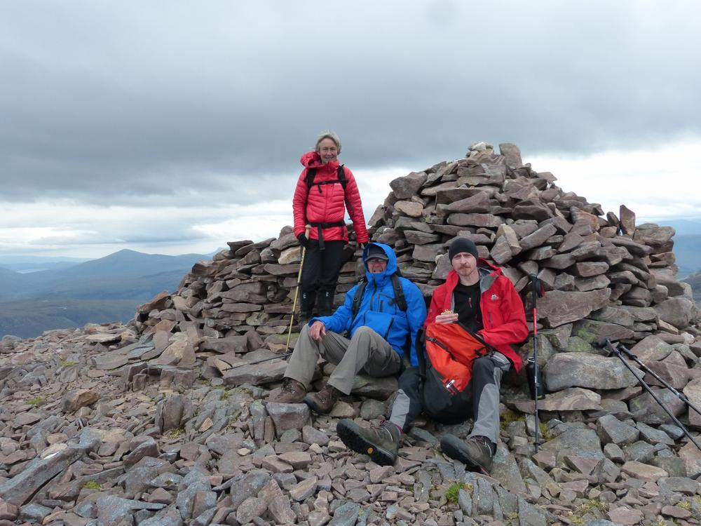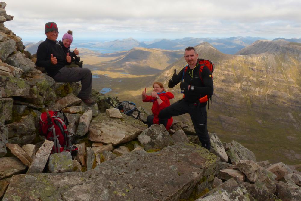 Expecting poor weather on Sunday I don’t think I would be far wrong by saying a few people were actually disappointed the weather had turned out well: this means we have to go out and do something! Kenny, Kate, Marcus and I headed for the wee Corbett Meall a’Ghiuthais from the beautifully kept Beinn Eighe nature trails, encountering near-gales on the summit. Quite a change from yesterday’s bluebird. Tim and Chris R were nearby on the steeper Corbett of Ruadh Stac-Beag which nestles in the lea of Beinn Eighe itself, and texted us to tell us they could see us at the top! (Chris – a good little ornithologist – was presumably carrying his binoculars!). Philip did the weekend’s most popular two Corbetts.