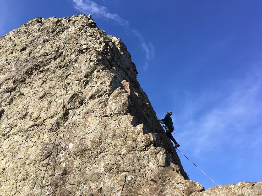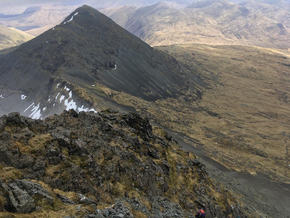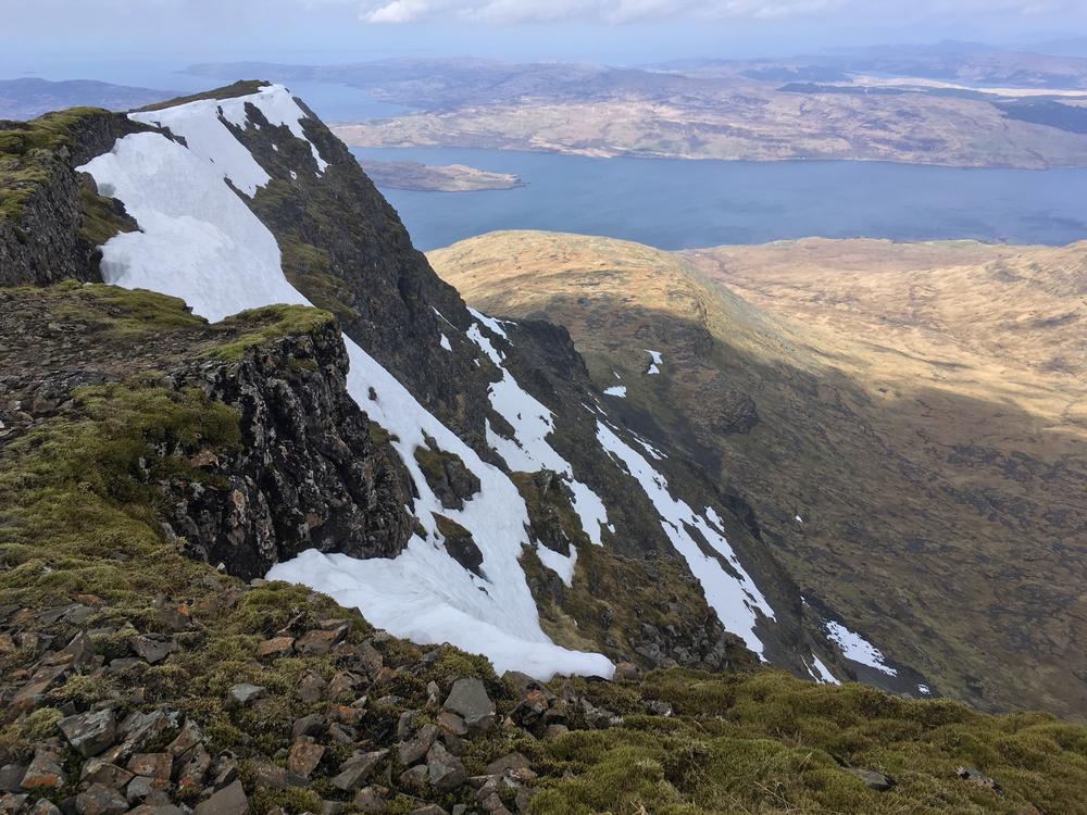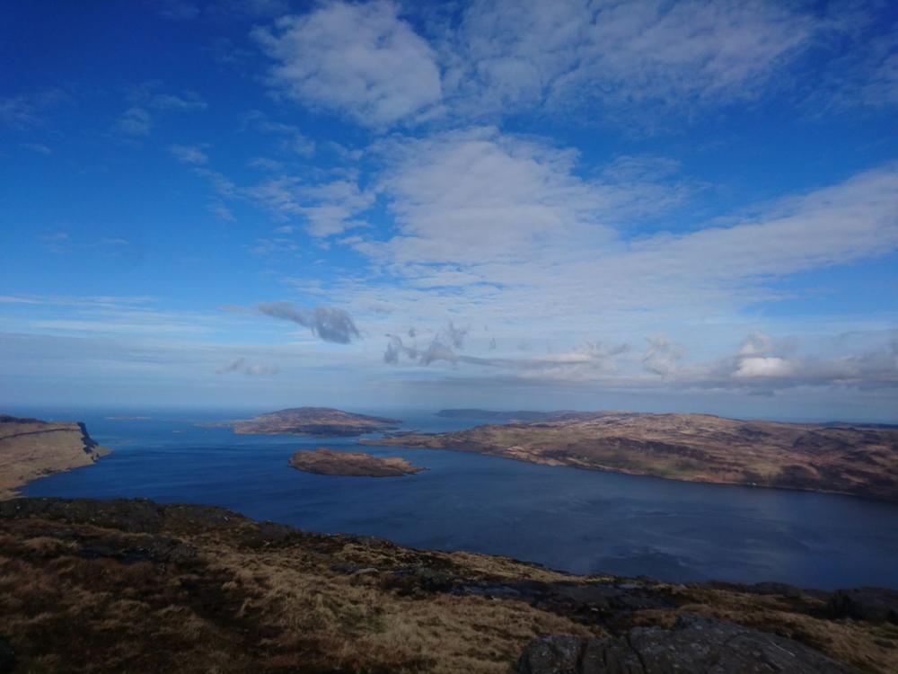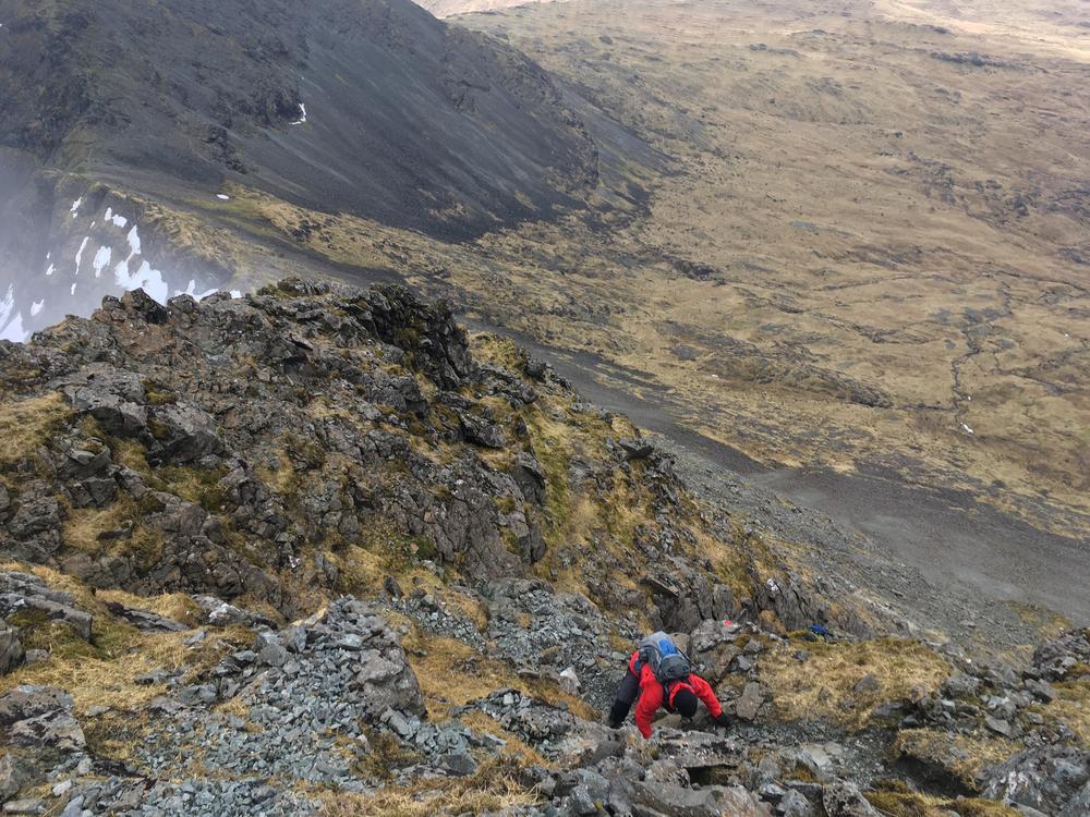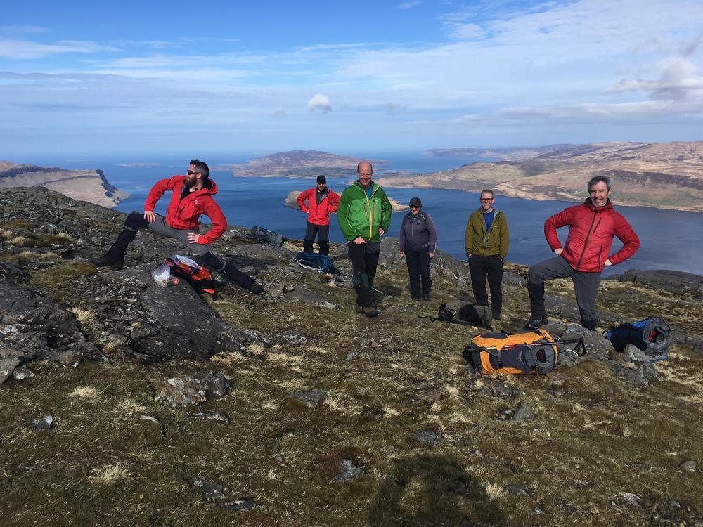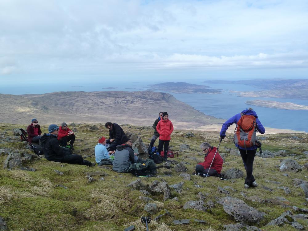 All the Ben More parties were off the hill by mid-afternoon and enjoyed the glorious weather with low level walks; all kept themselves busy. A few went climbing on a bolted basalt wall at Stac Liath, where Chris R1 attempted his inaugural rock climb.