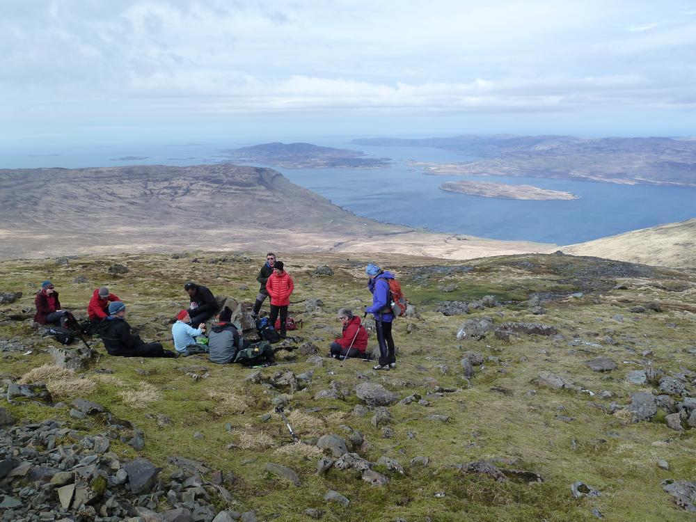 On Saturday, there was a mass assault on the island’s only Munro, with 17 folk tackling Ben More by various routes in four parties. Fiona M and Susan the speediest to reach to Ben More via A’Chioch descending quickly down the tourist track, passing the party of six on their way up via this route. This comprised of Kate, Gillian, Harsh, Matt, Allan S and Sinead. A group of seven, comprising Duncan, Fiona C, Chris R1, Chris R2, Alexander, Marcus and Keith went over A’Chioch and Beinn Fhada on the way to Ben More. These two groups reached the summit at the same time, just as the cloud lifted from the top, giving cracking views across the islands to the west. Dave and Pauline went over A’Chioch on the way up.