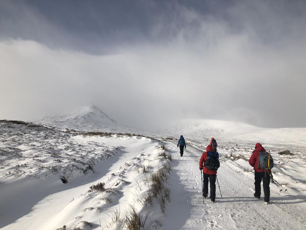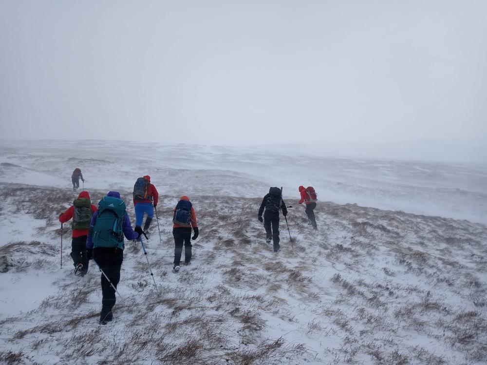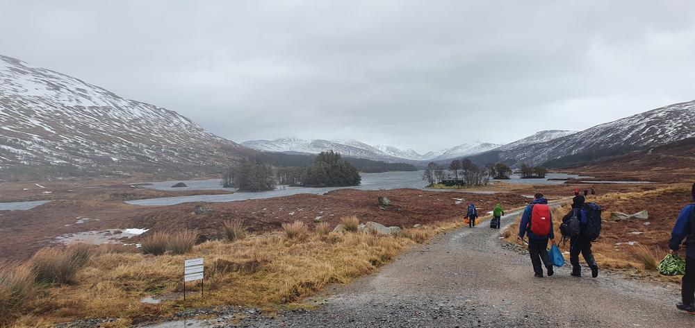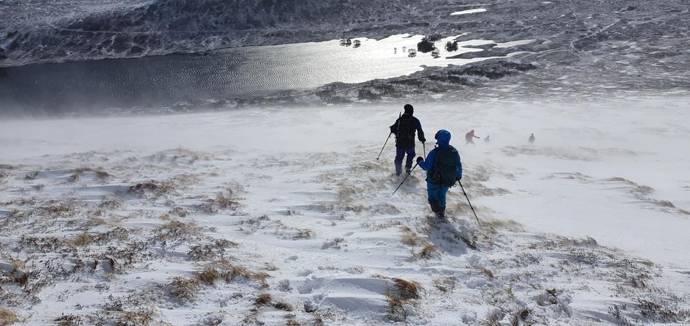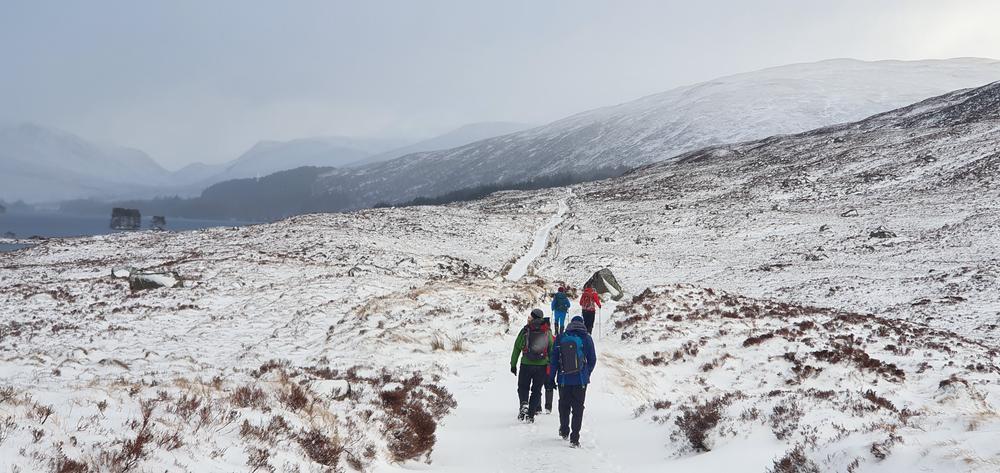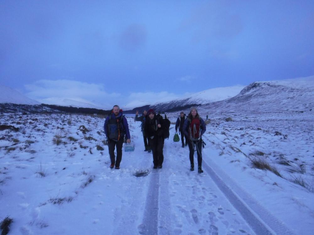 The bulk of the crew took the afternoon train from Crianlarich and arrived at the bunkhouse around 4pm, a quick wander up the Loch for some and then dinner. Fiona M, Mike & Fiona R came on a later train from the north and Emma C, Claire H, Martha & Kamila came in on the late train just before 10pm. A windy night for all with gales and snow blizzards throughout the night and then a reasonably early start on Saturday,