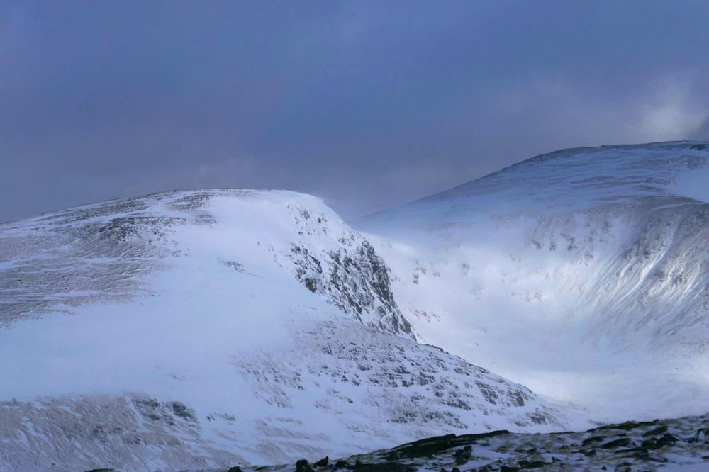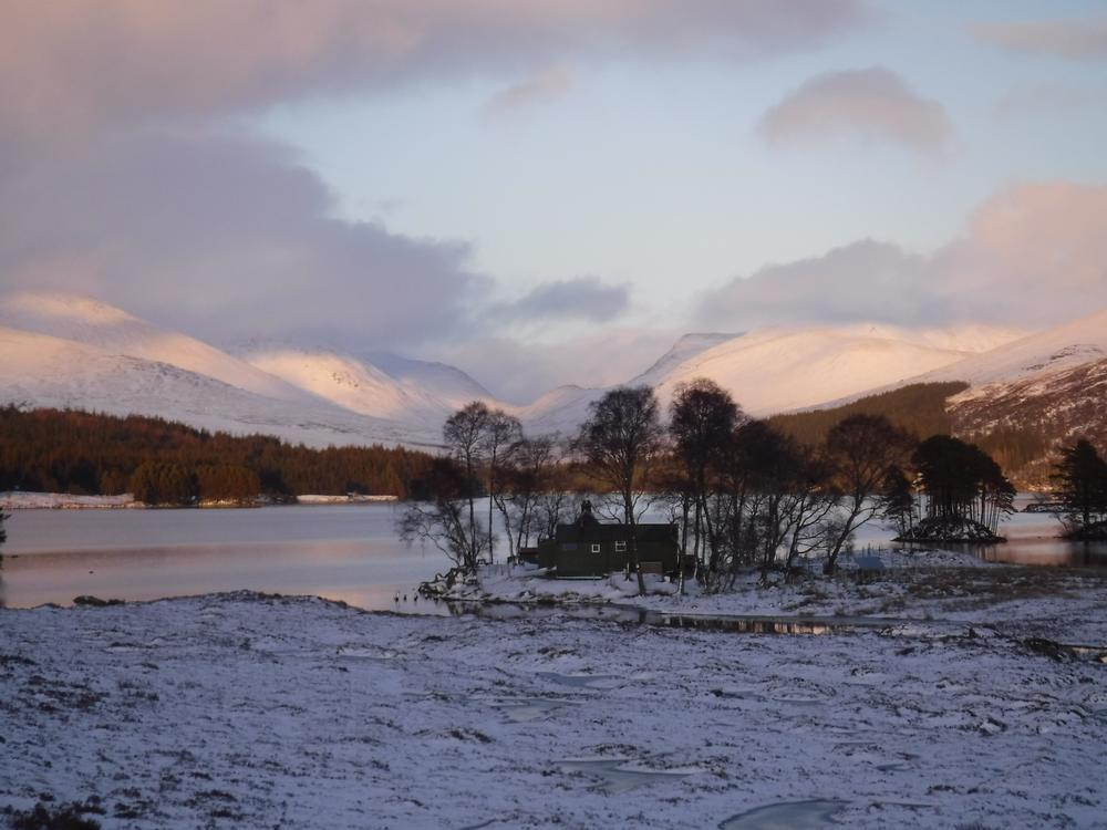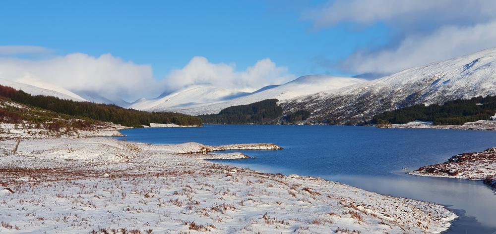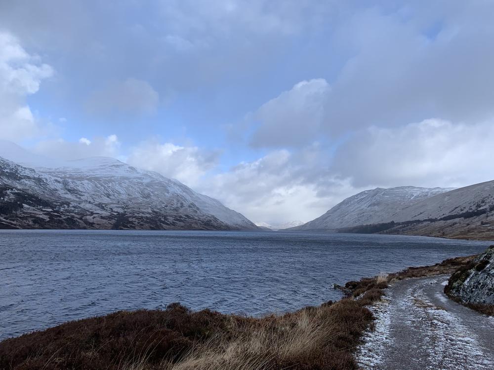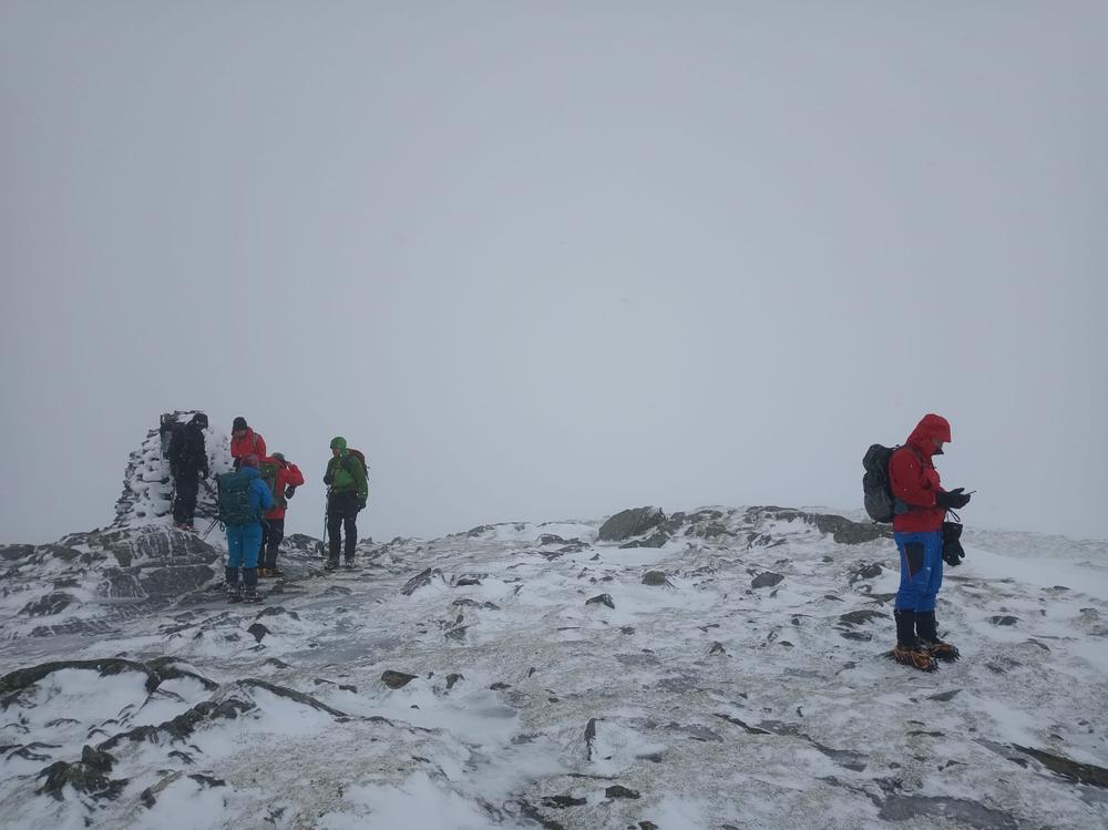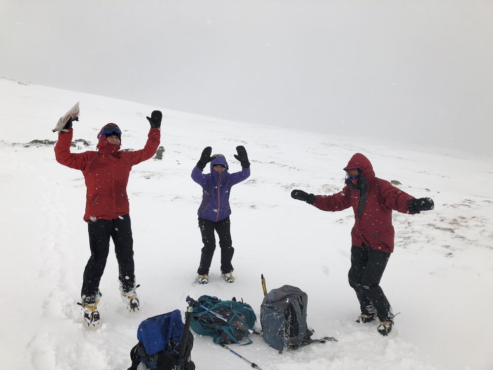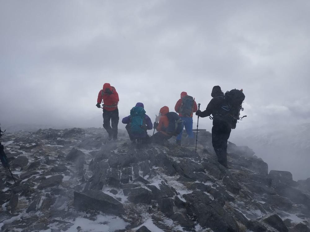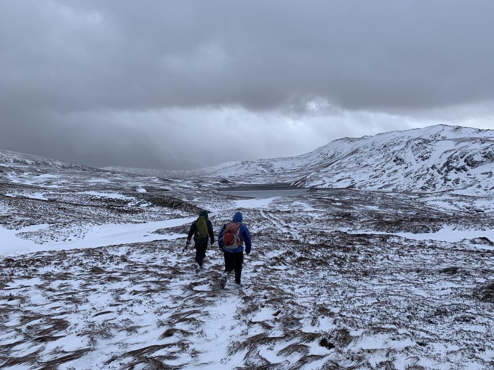 Sunday looked a better forecast, and the group split in two to go up either Carn Dearg & Sgor Choinnich, or Leum Uilleim. The weather was still squally and views from the summit were fleeting to none existent, but everyone made it back to the hostel in one piece – despite my attempt to go bog snorkelling having fallen through snow between the two Munros and getting stuck up to my waist in bog and snow (see pics). My fellow walkers helped me out, some physically, others with moral support…as they called it…laughing and taking pictures of the numpty stuck in a hole on their phones (TBF I would have been the latter if it had been someone else)! Its a good job I could see the funny side as I was wringing black bog water out of my socks! Anyway…the sun came out (once we were off the hills!!) and it was a lovely walk back around Loch Ossian.