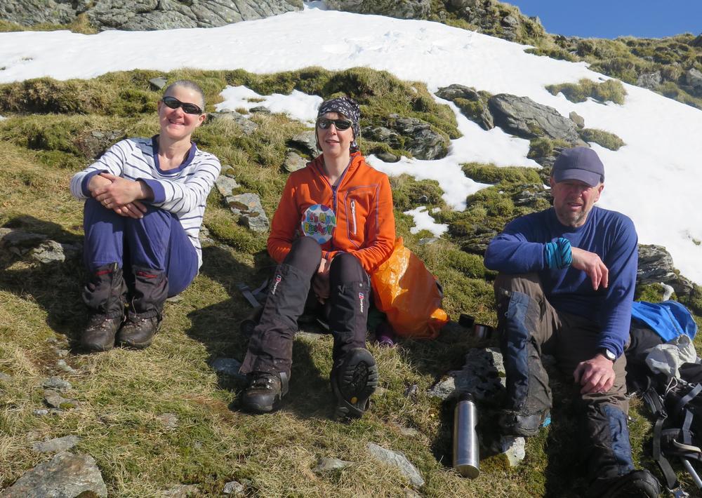 After such a glorious day, spirits were high back at the hut; further helped by Kenny popping open the champagne to celebrate Alison’s 50th Birthday. Gifts (many liquid I may add) and cards emerged from hidden places. All going well, until Alistair’s dog made an entrance causing me to scramble for the hut rules !