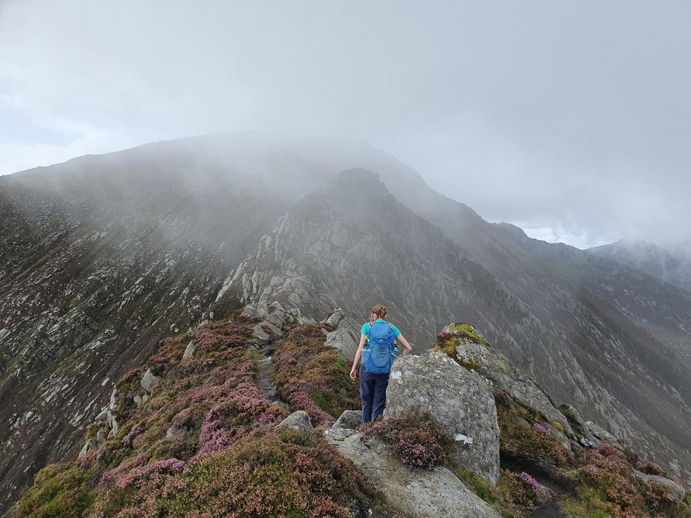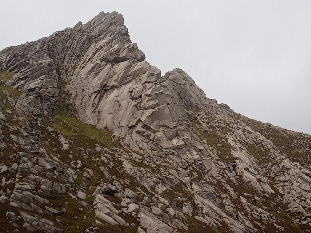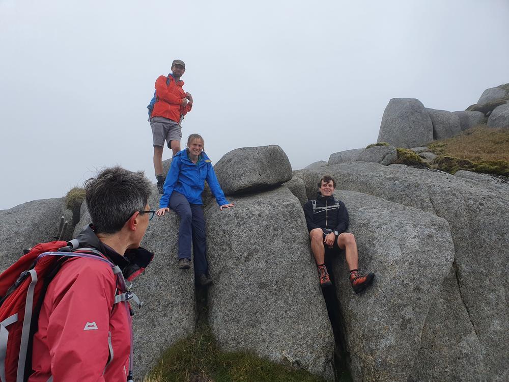 David turned down the glen at The Saddle and the rest of the group reunited on our way up Cir Mhor only to nearly lose some members to shock when Doug and (sister) Emma jumped out from behind a rock on Caisteal Abhail having reached the top of their climb just minutes before. We scrambled our way to the Witches’ step as a large group in the mist, leaving Doug, (sister) Emma, and Kai to wriggle their way up it in the wet, while the rest of us took the adventurous (grade 2!?) bypass option.