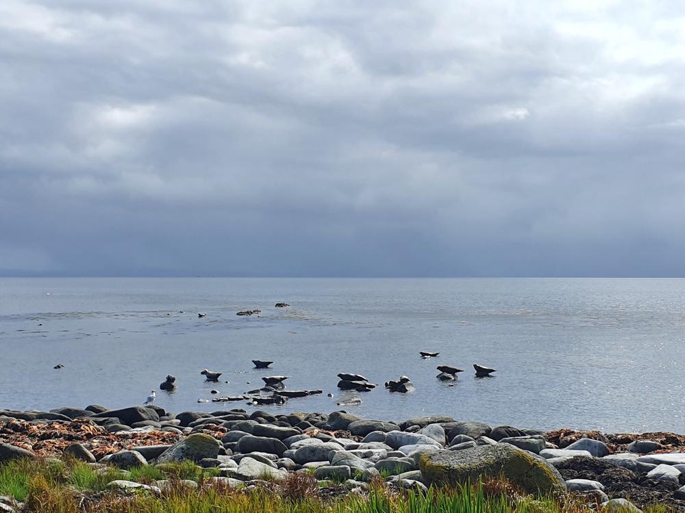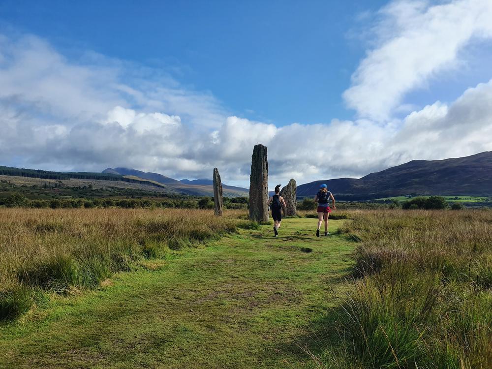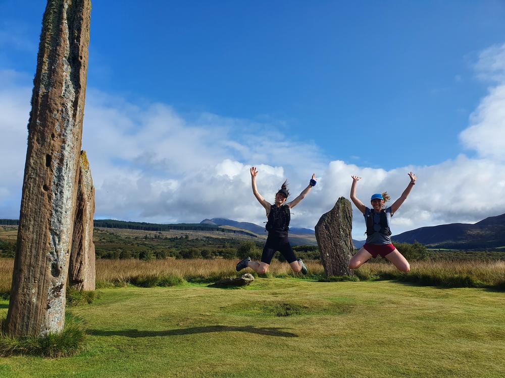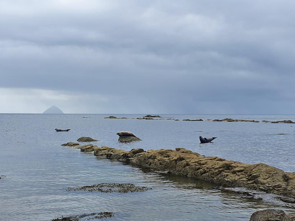 By Monday, the broken wheel was replaced, so it was time for a cycle for Bethany and Kai, and separately Keith, who left from Lochranza rather than Brodick. Kate and Allan dropped the cyclists in Brodick and headed for the beach and woods behind the castle. David T headed up the Mullach Buidhe (sadly no views this day either!). Meanwhile, another team (Karen, Mike & Brendan) headed round the Cock of Arran to find more dinosaur footprints. The running trio toured the standing stones near Machrie, opting for a dubious “island hopping” route though a very scratchy bog which filled us with blackberries but destroyed any skin not already taken by the granite. We took in the caves of the west and south coasts, visiting many seals and a further “dinosaur” footprint, and, of course, dipped in the sea, en route.