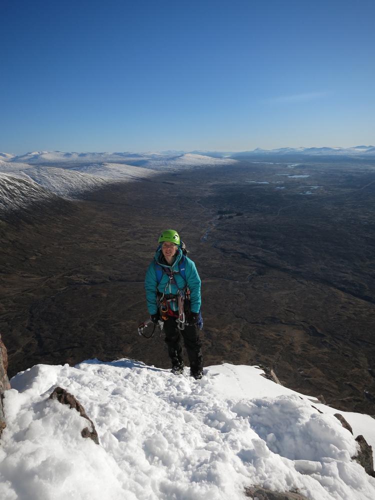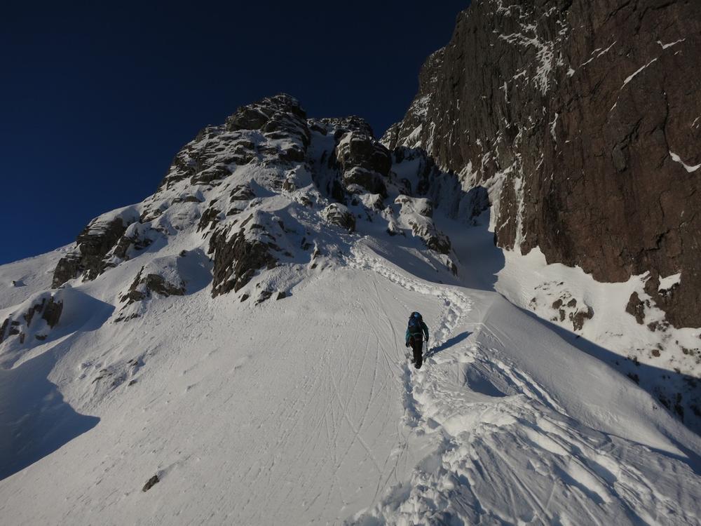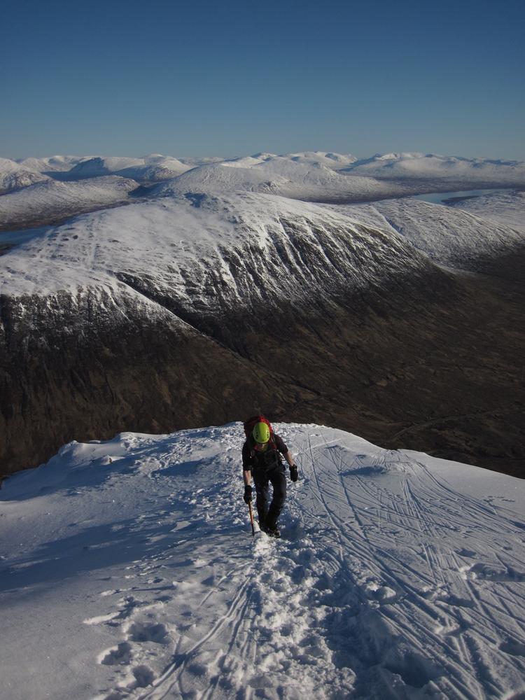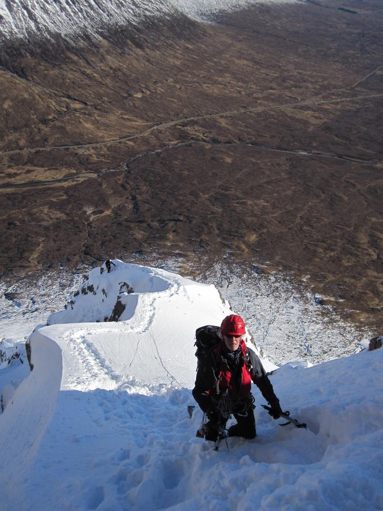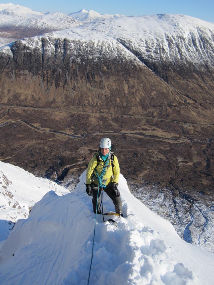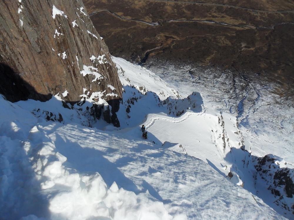 On Sunday, Curved Ridge was a popular choice with three parties (Martin, Kenny, Tim, Helen, Mike and Fiona) off up it. Mike and Fiona managed to solo ahead of the parties ahead of us, get down early and – after a pause for chips & cake – decided it’d be a waste to not use the rest of a fine day so polished off Stuchd an Lochain for dessert. Kate, Allan, Alison and Perry did the Glen Orchy Corbetts (Beinn Bhreac-liath and Beinn Udlaidh), reporting brilliant views… including a huge avalanche on the east side of one of the hills between Glens Etive and Kinglass. Alison and Fiona went hunting obscure routes at the Boomerang Arete end of Stob Coire nan Lochan. Claire and Antti had to head back to Edinburgh but still managed a 15km run south along the WHW from the Kingshouse with fine views of the Black Mount. Philip had stroll along the wee Buachaille (encountering several guides and clients; apparently it’s used as some sort of “training ridge”). Tony did Beinn a’Chrulaiste from Kingshouse with magnificent views but surprisingly hard work trail blazing. Chris did Fraochaidh and Katrina did Schoolhouse Ridge.