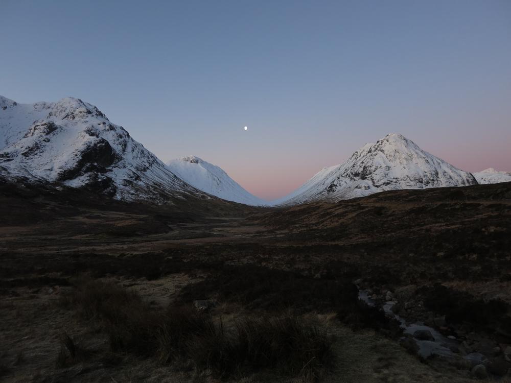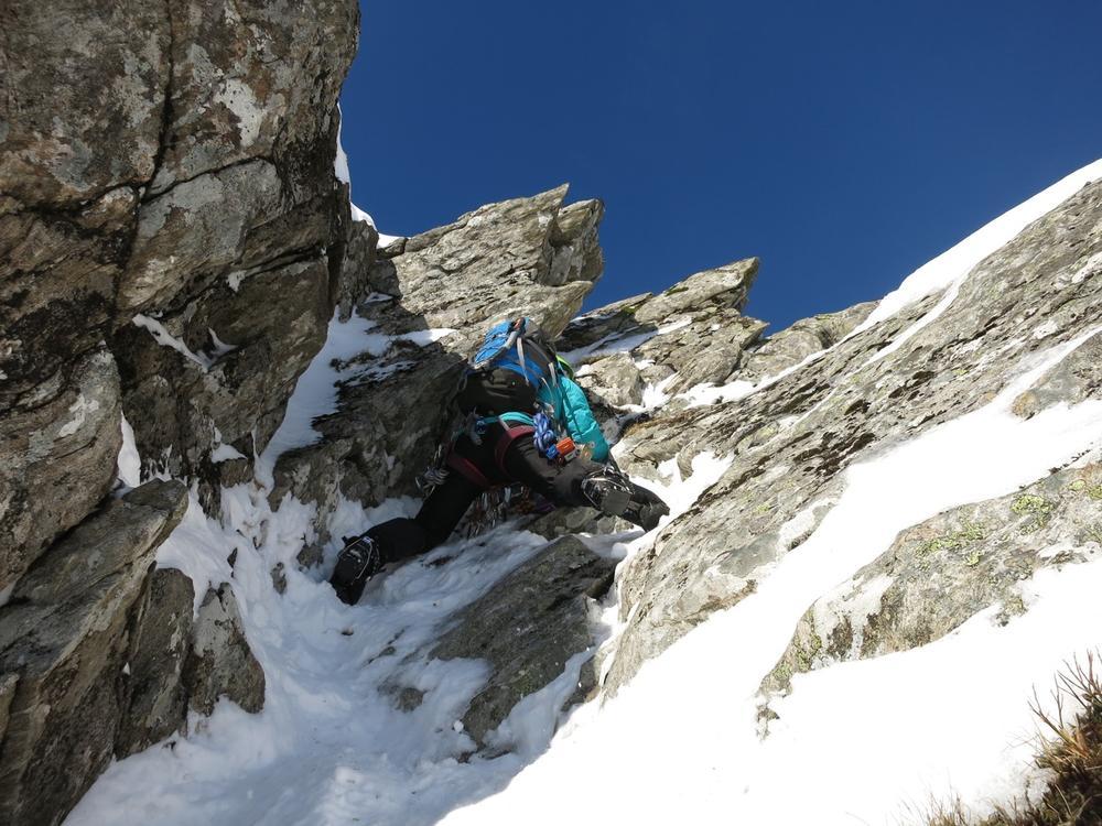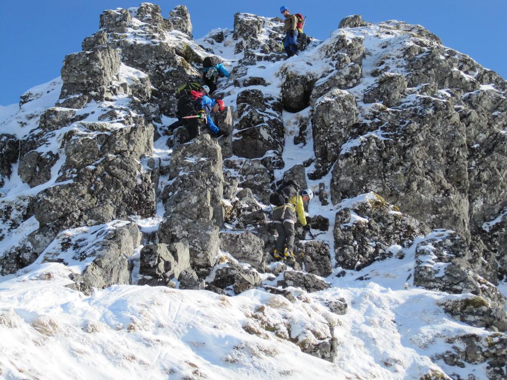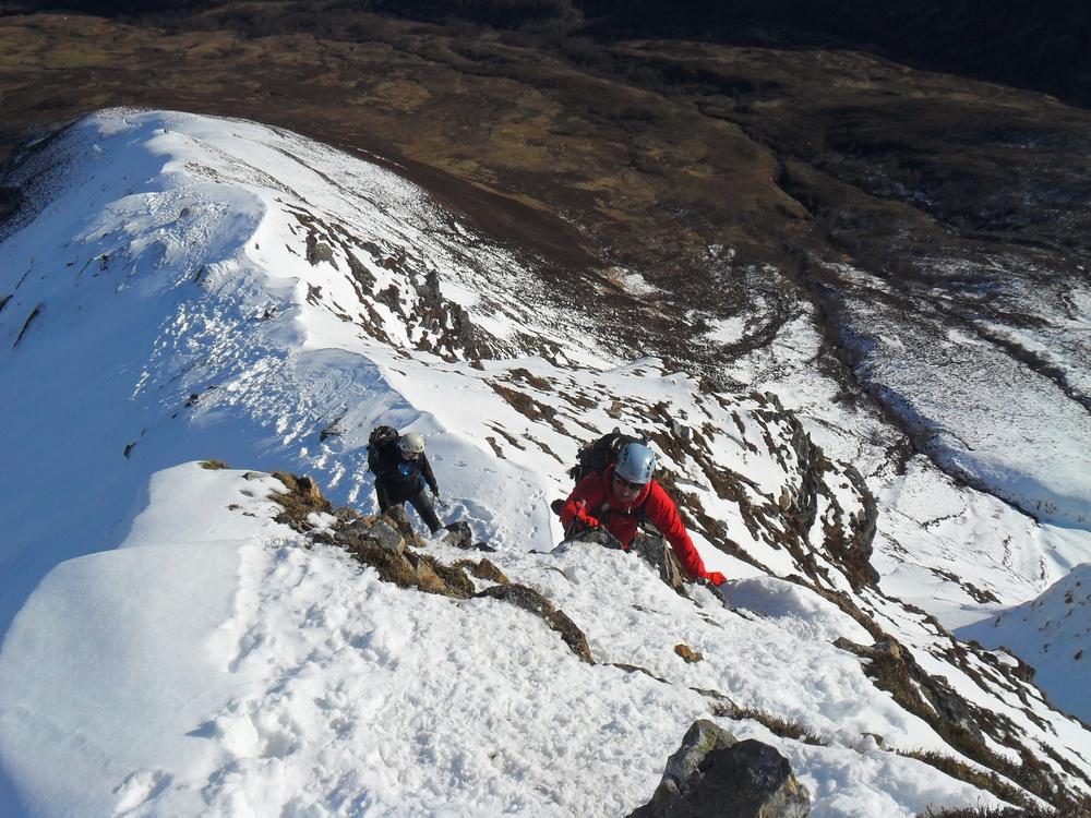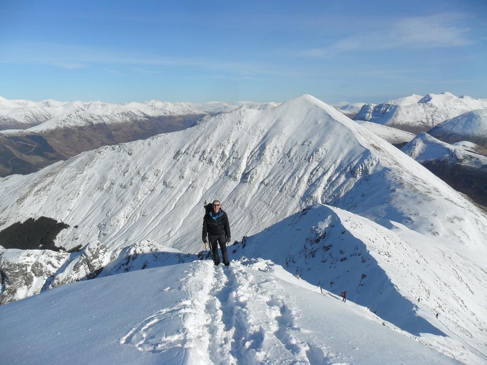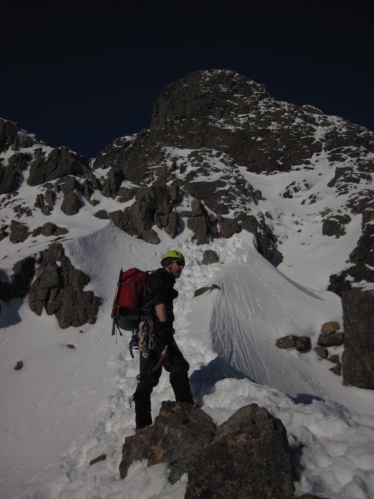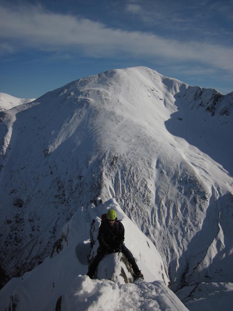 On Sunday, Curved Ridge was a popular choice with three parties (Martin, Kenny, Tim, Helen, Mike and Fiona) off up it. Mike and Fiona managed to solo ahead of the parties ahead of us, get down early and – after a pause for chips & cake – decided it’d be a waste to not use the rest of a fine day so polished off Stuchd an Lochain for dessert. Kate, Allan, Alison and Perry did the Glen Orchy Corbetts (Beinn Bhreac-liath and Beinn Udlaidh), reporting brilliant views… including a huge avalanche on the east side of one of the hills between Glens Etive and Kinglass. Alison and Fiona went hunting obscure routes at the Boomerang Arete end of Stob Coire nan Lochan. Claire and Antti had to head back to Edinburgh but still managed a 15km run south along the WHW from the Kingshouse with fine views of the Black Mount. Philip had stroll along the wee Buachaille (encountering several guides and clients; apparently it’s used as some sort of “training ridge”). Tony did Beinn a’Chrulaiste from Kingshouse with magnificent views but surprisingly hard work trail blazing. Chris did Fraochaidh and Katrina did Schoolhouse Ridge.
