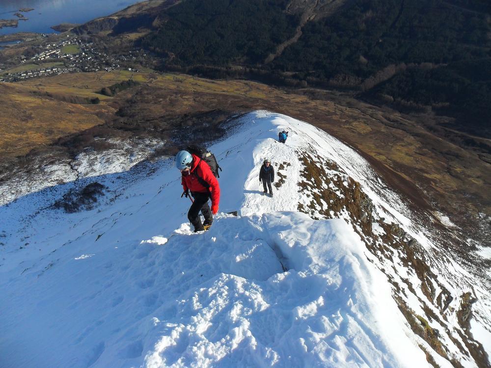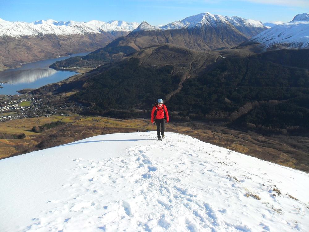 On Saturday, Helen, Paul (up just for a day trip; the conditions were worth travelling for) and myself ticked off a long held wish to do a winter Aonach Egach traverse, which was as excellent as hoped. Not too busy on the ridge, and we traded abseil setups with another party. Meanwhile Claire, Kat, Philip and Antti were having a “belter of a day” across the way on a Bidean traverse along the “christmas cake icing” ridge. In the other direction Tony was also nearby on Garbh Bheinn. Kate, Allan, Alison and Perry were repelled by the Stob Dubh’s steep Glen Etive slopes and avalanche concerns; they will be back with a “grass axe” when there’s no snow. Chris was latest back to basecamp, bagging two Glen Etive Corbetts on a day “about three hours longer than he would have liked”. Mike and Fiona did that club favourite East Ridge of the North top of Stob Ban. Allan and Anne went round to Glen Nevis and did the Ring of Steall, and Alison, Kenny and Fiona headed for Aonach Mor and did Western Rib. Martin, Keith and Harry did Schoolhouse Ridge on Beinn a’Bheithir above Ballachulish; the characteristic arc of the ridge connecting Sgorr Bhan to Sgorr Dearg – sharpened to a snowy cusp – was certainly a distinctive feature of the skyline this weekend.