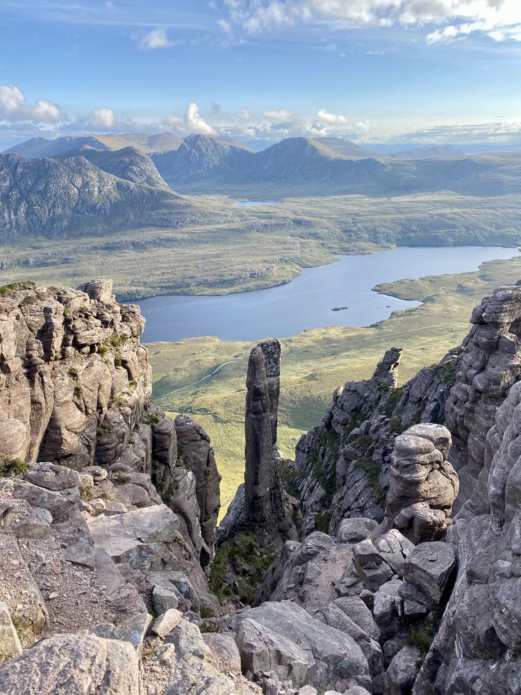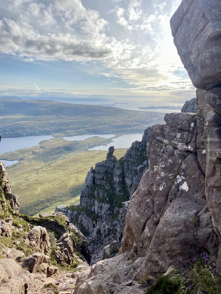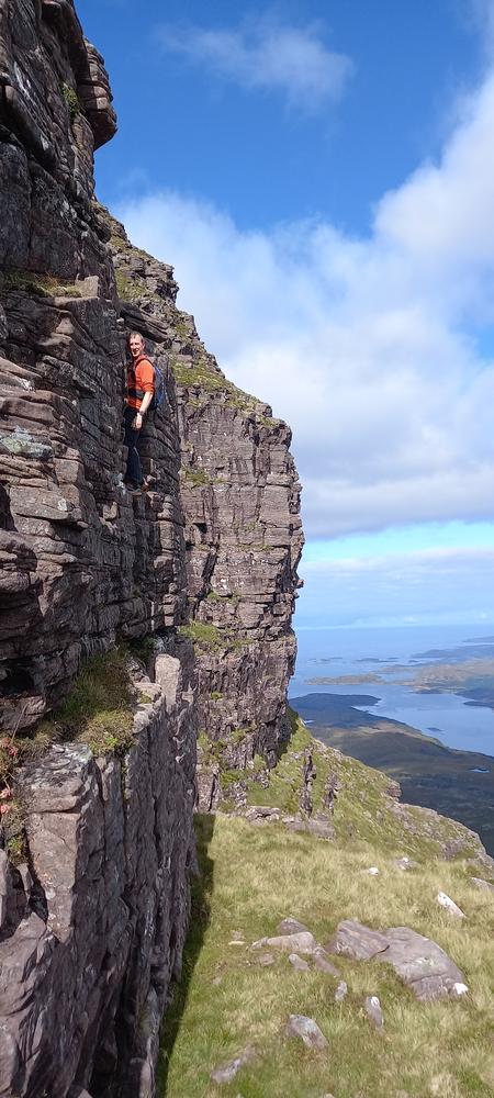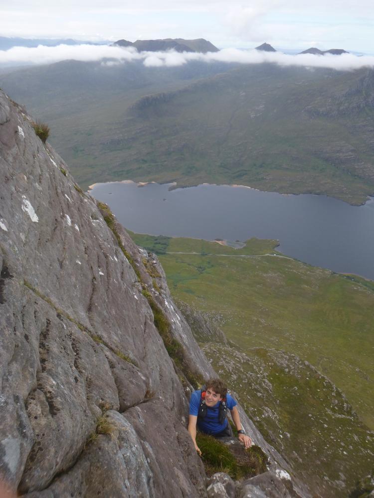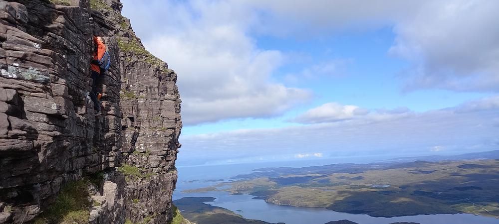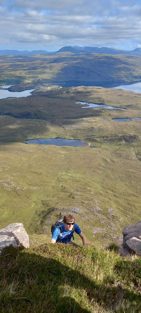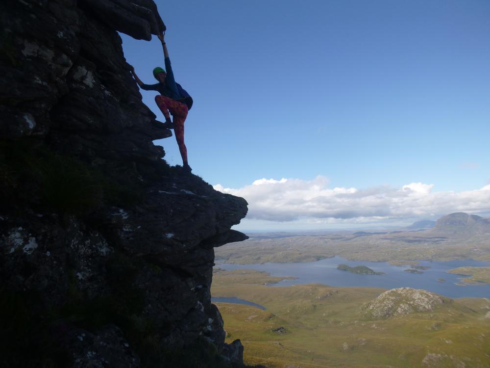 The weather got even better on Saturday. Neil and Claire originally had climbing plans – but when they realised that those would be incompatible with the opening hours of the Lochinver pie shop, they instead joined Kei on a scrambly adventure up Quinag. Despite Claire’s amazing buttresses, this wasn’t quite enough for Kai – so he also went up Conival and Ben More Assynt, whilst Claire and Neil stocked up on pies and explored the Bone Caves.