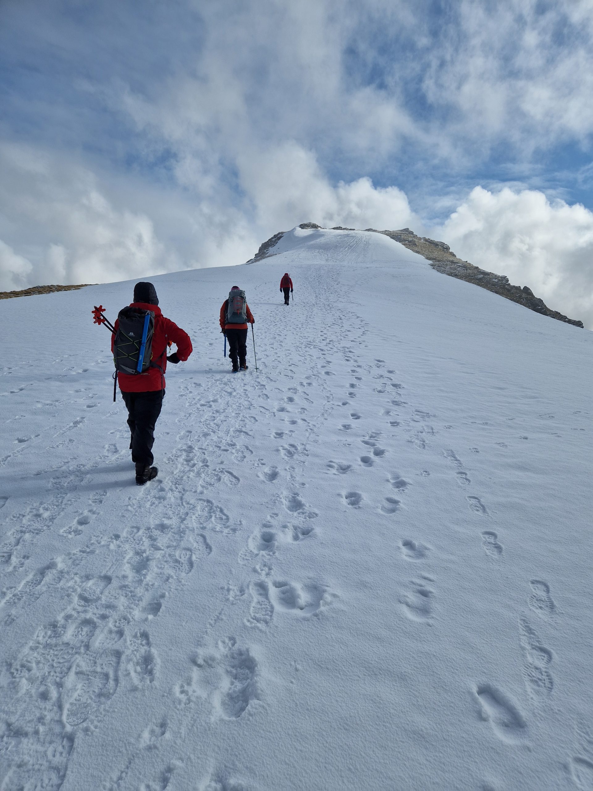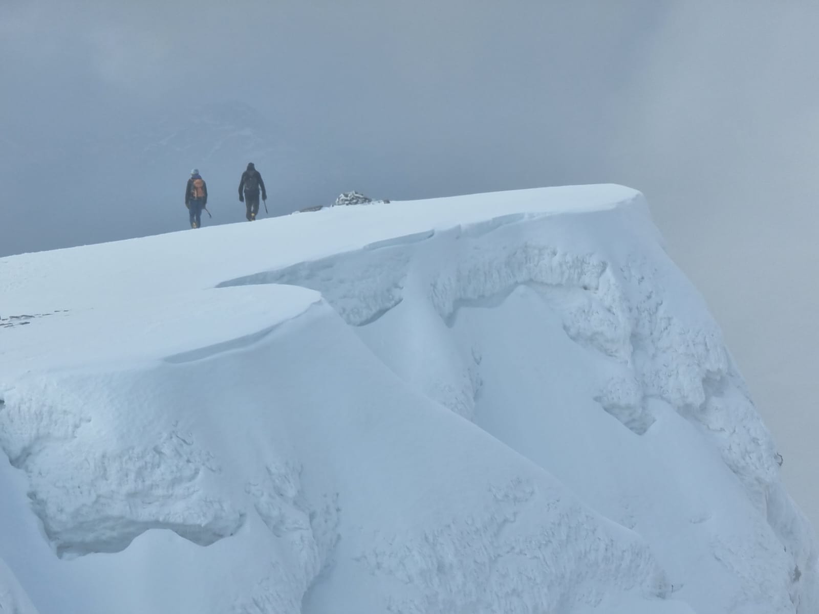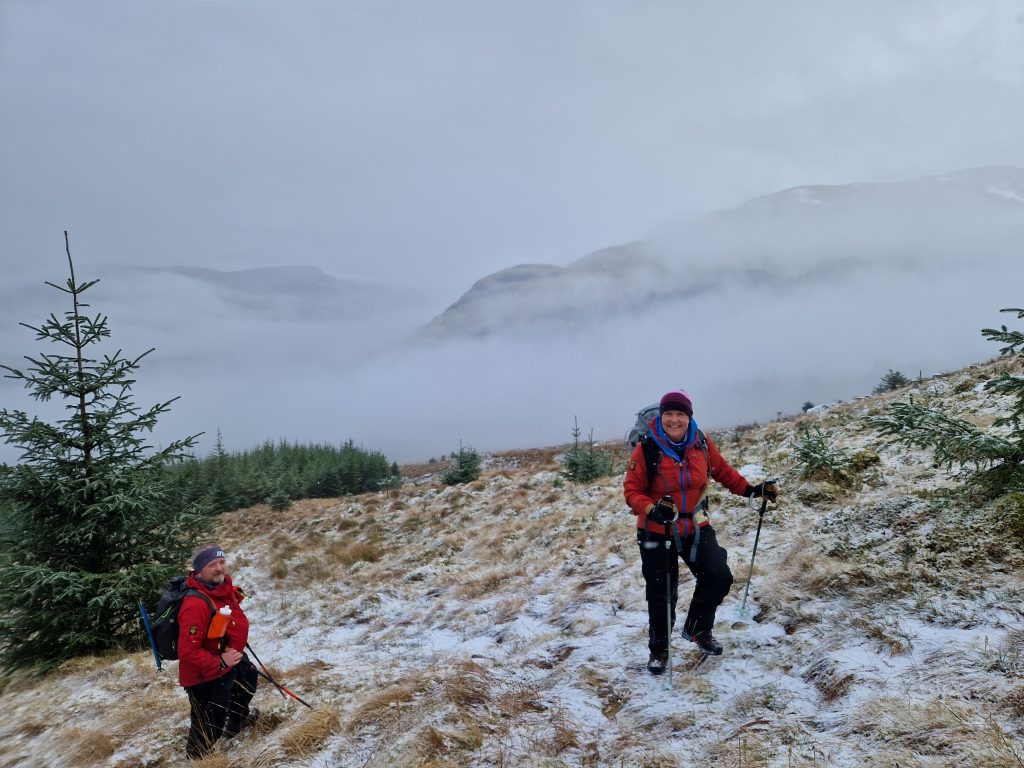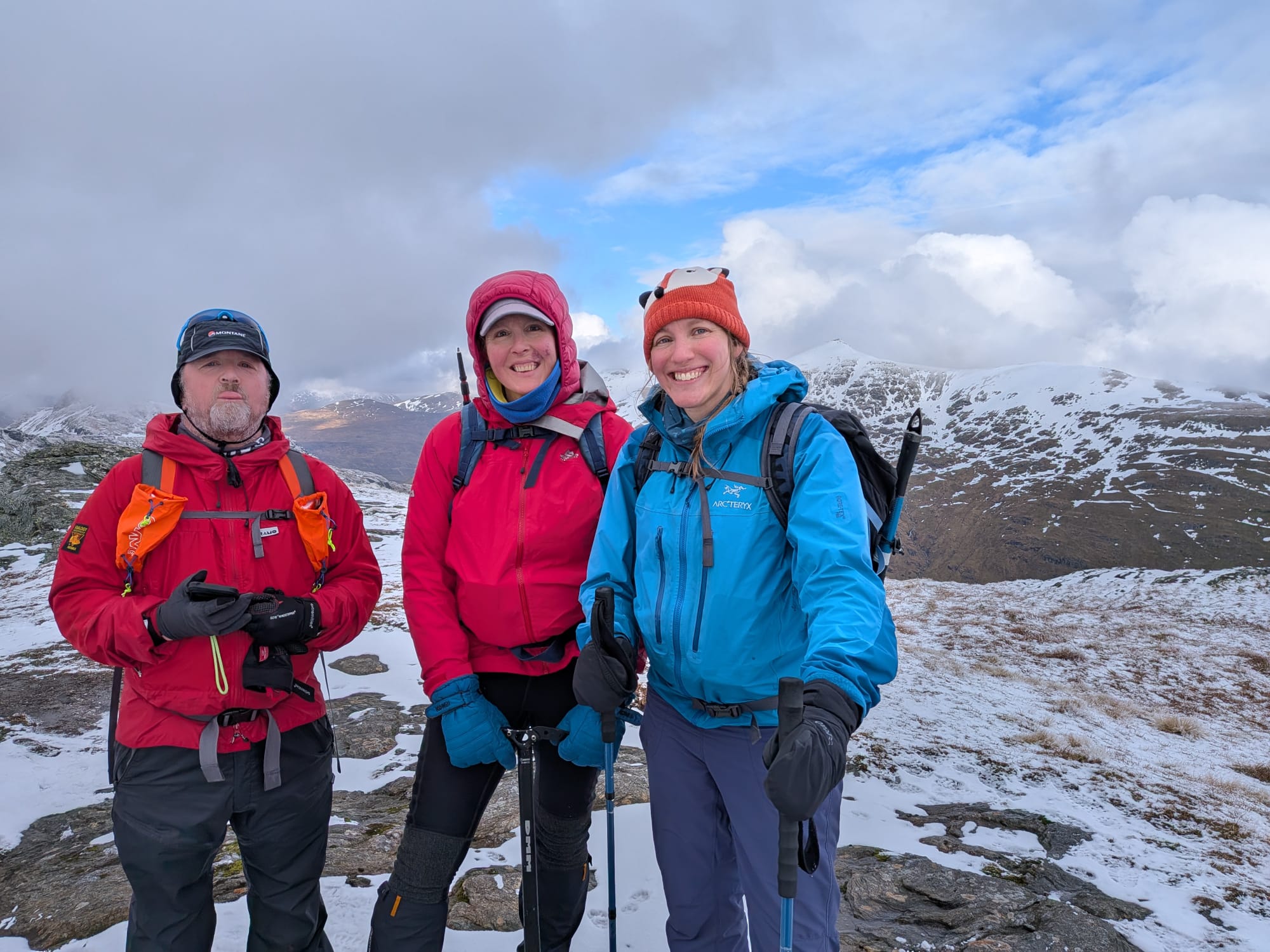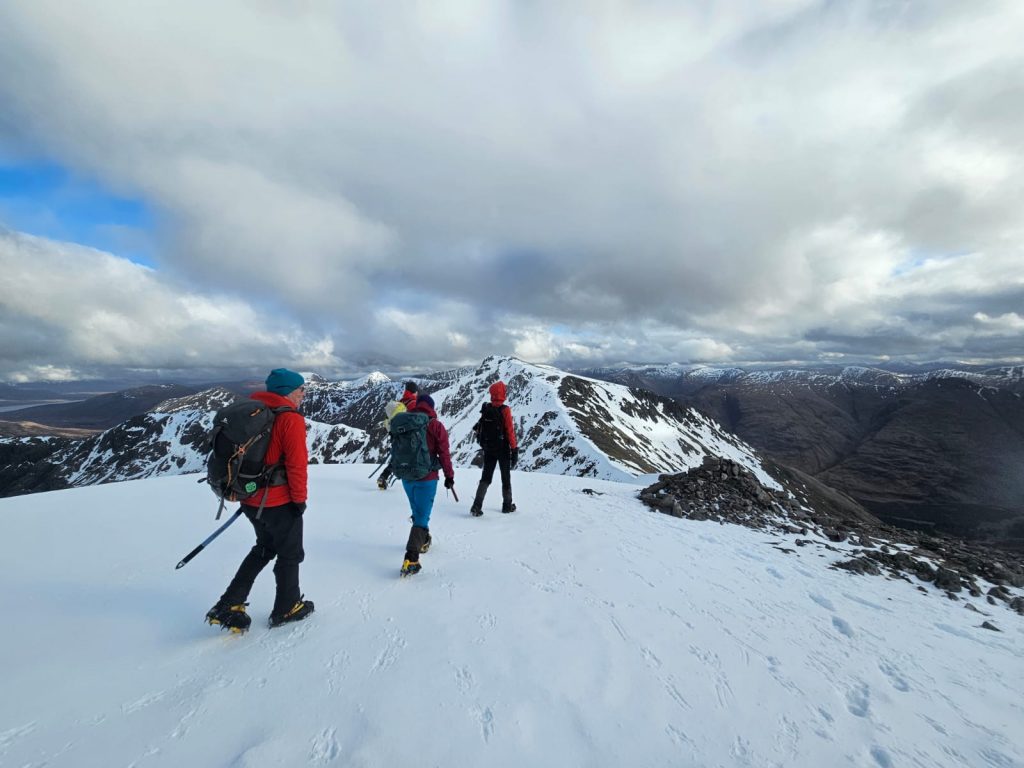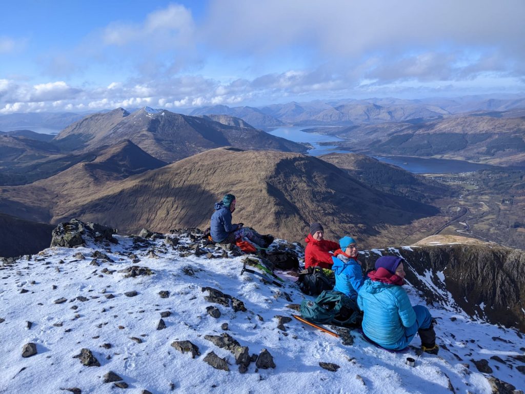 On Friday Mike and Fiona played up on Sgurr a’ Mhaim and the Devil’s Ridge. Pauline and David were up on Meall nan Tarmachan, with snow to practice sliding on near the summit. Martha met up with Alison C at the Achallader farm car park. They headed up the col between Beinn Achallader and Beinn an Dothaidh and then contoured round to summit Beinn Mhanach and its top, Beinn a’ Chuirn. They had a great day with snow flurries and sunshine, got a free exfoliation provided by a graupel shower, and some lovely views on the summits. After the walk, Alison headed north to a different meet, whilst Martha headed south to the Inverardran hut in Crianlarich.