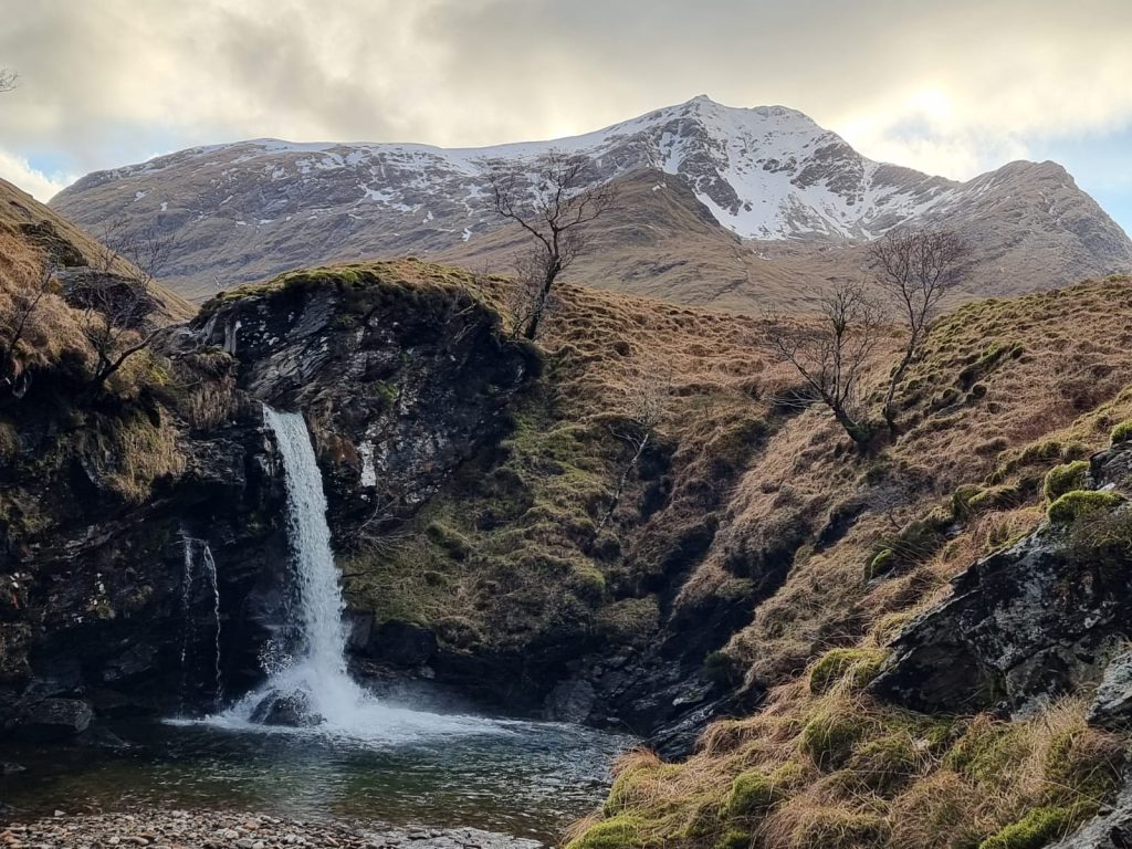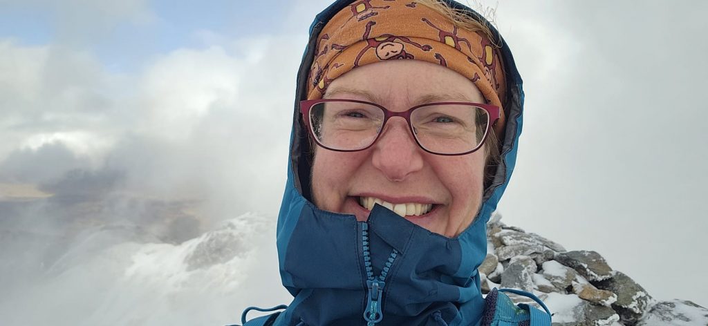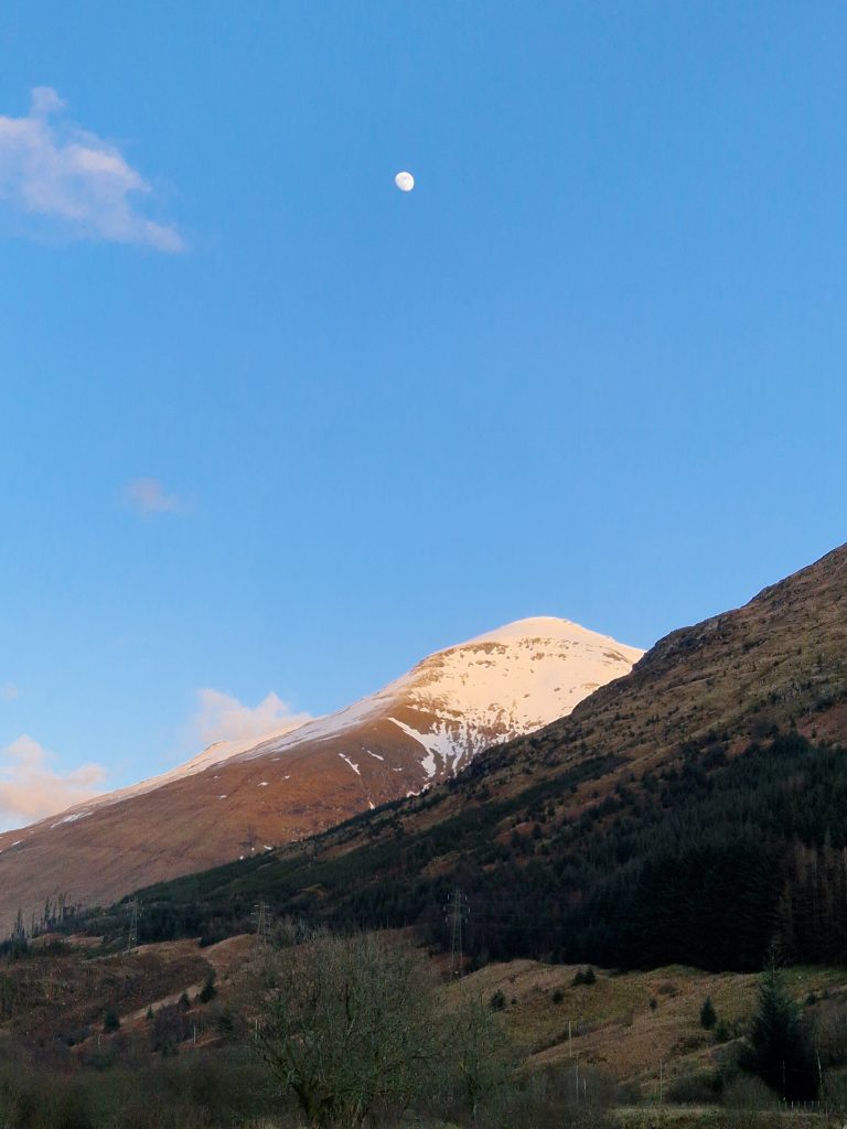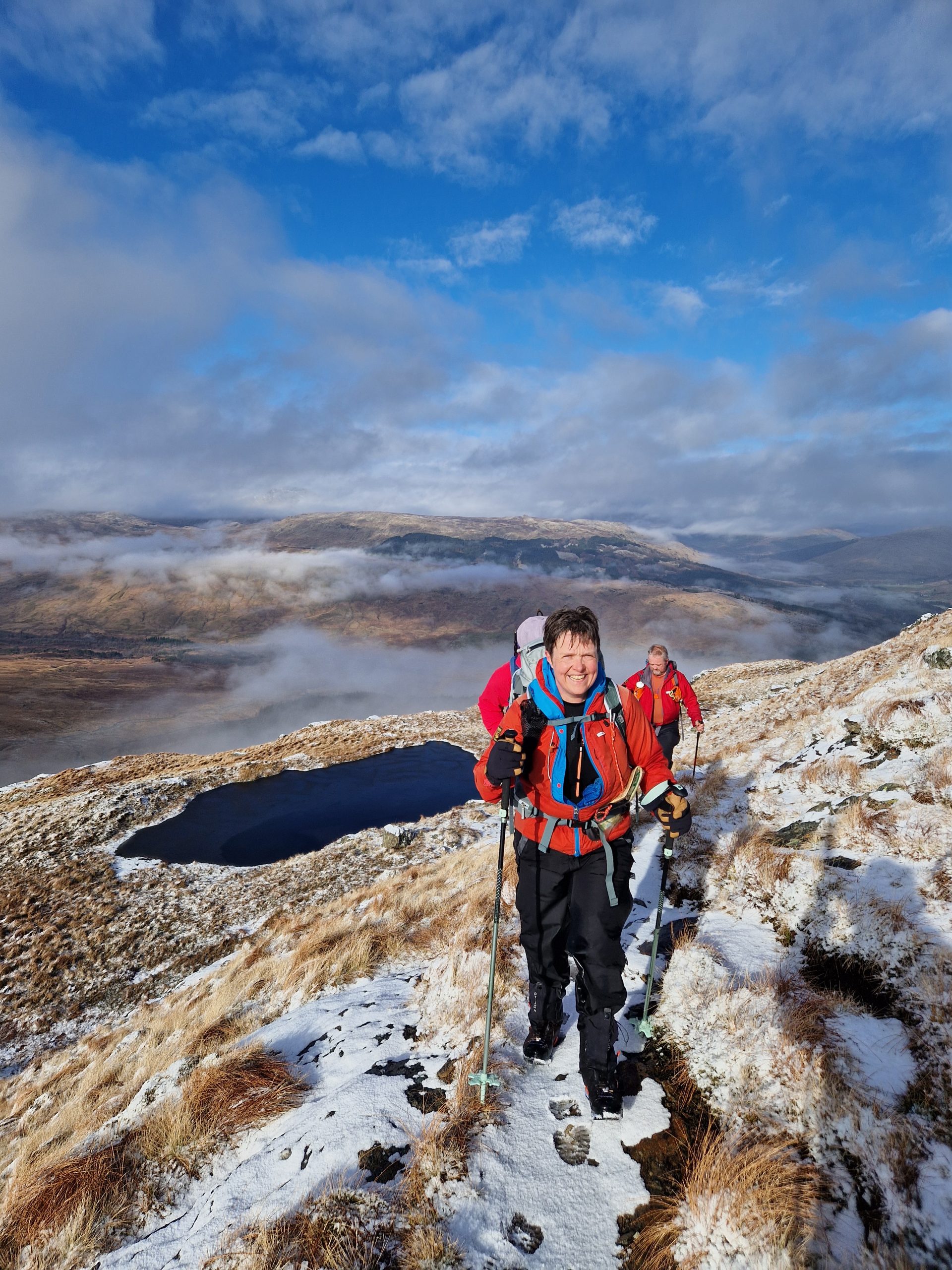 Claire “I bit off more than I could chew” set of early, setting out to traverse the entire line of hills south of Crianlarich starting at the Ben More end. She had a very localised (personal?) black leaky cloud directly overhead when everyone else seemed to have blue skies! Meanwhile Pauline, Dave, Sue and Rhi had set off directly from the hostel up Cruach Ardrain. Rhi delighted in the bog-fest of a forest on the ascent (not sure the delight was shared). We had f’lunch* in the sun on the way up, enjoyed the frozen snow higher up, and happily bumped into Claire and her personal cloud just after the summit, which allowed us to enjoy s’lunch* in the sunshine on the ridge to Beinn Tulaichean, before heading to the pass to Benmore Glen. Claire headed down after Cruach Ardrain and was good enough to scoop us up and back to the hostel (thank you I also bit off more than I could chew!). Dave chose to walk back along the road (missing the handy disused railway which runs alongside it).