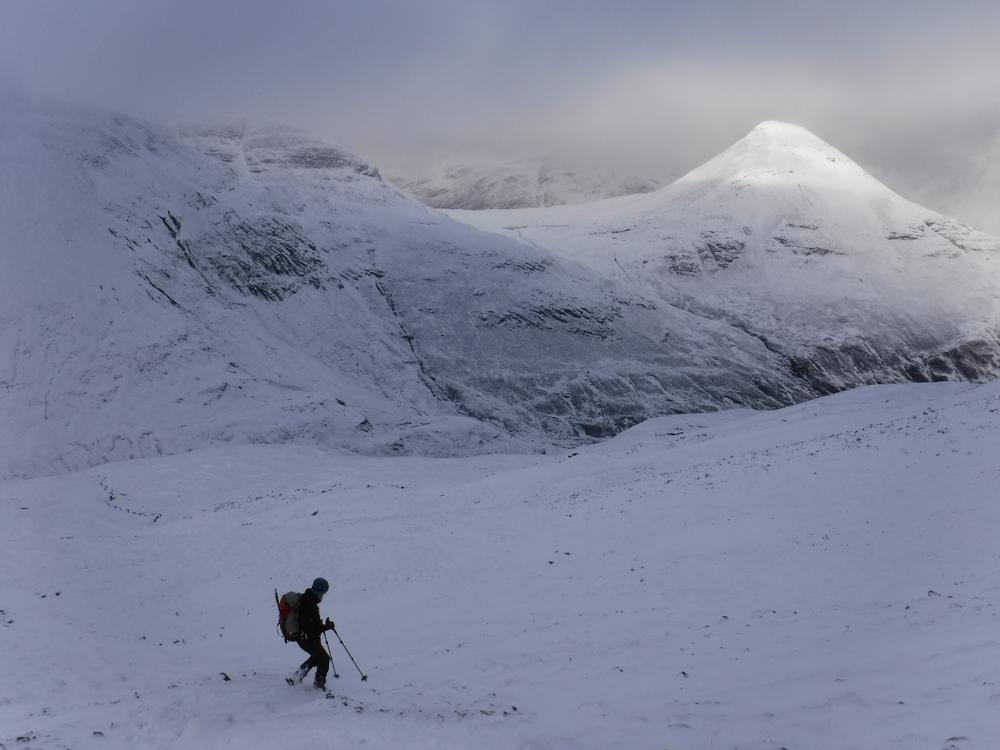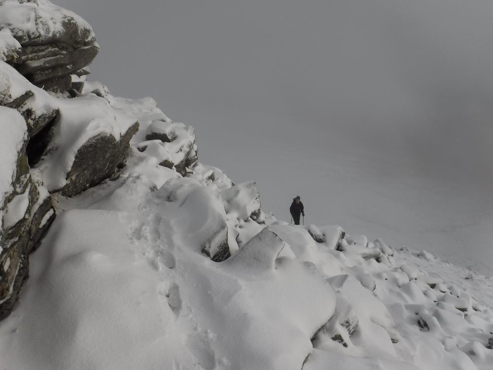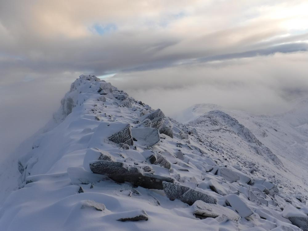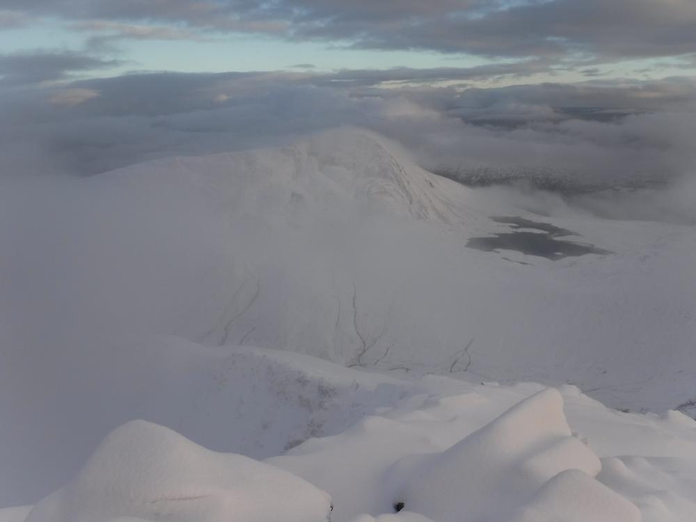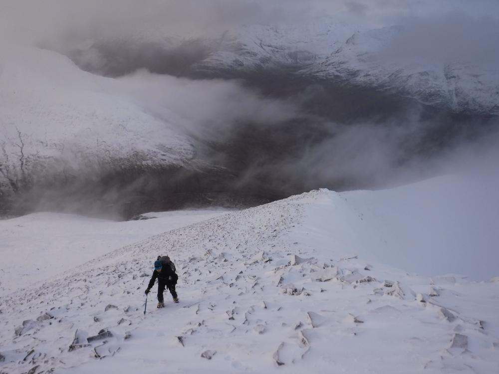 Sundays forecast suggested 80% chance of cloud free Munros and a very decent day in prospect. A few folks were therefore somewhat perplexed with the drizzle and low cloud that we awoke to but again optimism that it would improve sent us off up into the hills once more. Chris headed off on a monster trip to bag two Grahams and a Corbett. Katrina and Claire walked with him to begin with before heading for Sgurr Eilde Mor, sliding around on the boulder fields where they got some tantalising glimpses of a view. The continued on to Binnein Beag with the snow-covered ankle-breaking boulders making slow progress on both the ascent and descent. Their ascent of Binnein Mor was pretty treacherous, with fresh snow covering rock hard icy stuff. Claire went for a wee slide on this but thankfully without hurting herself. They topped out on Binnein Mor into the setting sun and an exquisite view across the Ring of Steall, quit whilst ahead and had an ounce of daylight, coming back down Sgurr Eilde Beag and the path and entering Kinlochleven with a bunch of army squaddies. Alison and Kenny headed off for Beinn Sgulaird, Anne, Alan and Fiona M headed for Glencoe with Creise, Clach Leathad and Meall a Bhuiridh being their objective. Sylvian and Rob had some navigational issue but eventually climbed Broad Gully in SCNL. Marcus was too wrecked from the Ring of Steall to join them so went for a walk to the Grey Mares Tail. Kate, Emma and Allan S had a lovely day going up Am Bodach in the Mamores. Monty and Clare headed for one of the Ballachulish Horseshoe Munros. Ken and Alison F headed for the Pap of Glencoe. Tony headed for Mam na Gualainn. Mike and Fiona R started off with a rather ambitious plan. They headed up the Zig-Zags on Gearr Aonach then onto the summit of SCNL. They had planned to continue to Bidean nam Bian and beyond but clag induced apathy resulted in a change of plan and instead they wandered around the coire and then sat watching all the climbers for a while.