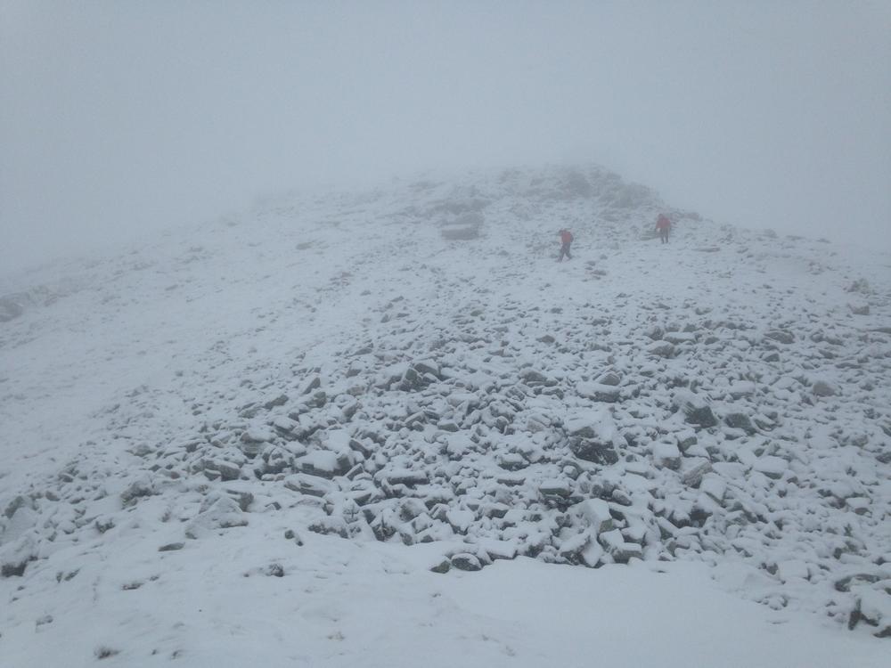 On Friday night the forecast for Saturday suggested early snow and rain would clear into a reasonable day by 10:30am. Alas by Saturday morning the “reasonable” part of the day had shifted back to mid afternoon. Most folks chose to take the optimistic view on things and headed for the hills regardless. A large party consisting of Alison F, Tony, Ken, Allan S, Kate, Emma, Monty and Claire headed for Glas Beinn. They crossed the new hydro dam at Loch Eilde Mor via a pallet board, and trudged up snowy wastelands to the beehive summit, meeting a runner who followed their steps on the way down. Most folks slipped at least once on the way down to the river Leven path and Claire was so cold that she needed both hot chocolate and cake in the Ice Factor. Dave and Pauline did Binnein Beag, Kenny, Anne and Alan post-poned departing for as long as possible in the hope of better weather and opted for a wee hill, Meall na Duibhe, straight from the hostel. Chris and Katrina headed for Mam na Gualainn and tagged on an extra Graham for good measure. Marcus, Rob and Sylvian headed for the Ring of Steall which took a bit longer than expected. Mike and Fiona R combined Garbh Bheinn with Meall Dearg a small bit of the Aonach Eagach and then walked along the ridge over Am Bodach and the 903m point to pick up the West Highland Way back to Kinlochleven. Despite various signs that the sun might make an appearance pretty much everyone remained in the clouds all day. Alison C and Fiona M took a more pessimistic view of the weather forecast (they clearly knew something the rest of us didn’t!) and opted to spend the day climbing at the Ice Factor. After 20 routes they looked almost as wrecked as some of the walkers! Clare A joined them for a bit and also did a session on the ice wall with an instructor.