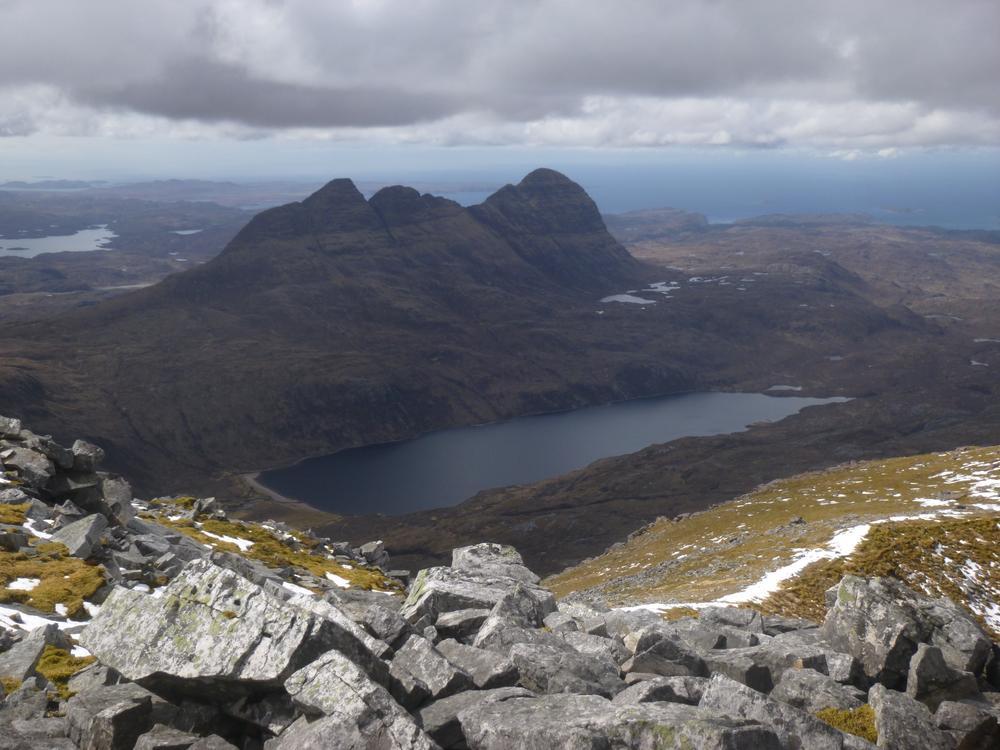 On Monday David J and I headed out for a short trip up Glas Bheinn, and were caught up on the summit by Tim N, Martha and Shireen who had stopped in the pie shop in Lochinver on the way. Claire H with Doug, Duncan I and Gillian were outraged to find the pie shop shut.. They went scrambling on Cul Mor (Gillian joined for the path bit). The weather improved but apparently not Claire H’s head for heights. Fiona C was planning to stay in the Torridon area for some camping. Fiona R and Mike W solved the pie shop mystery- they were switching to summer hours on 1st May but only changed the sign when they opened. They gave up on their scrambling plans because of the rain, then took a wander around Knockan Crag and to the lighthouse at Rhue.
