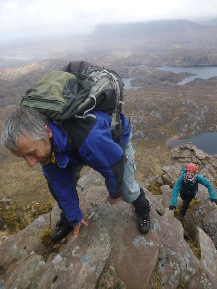 Many of the group decided to stop on the trip north for some activities. David and I headed for a bike ride from Dalwhinnie past Loch Pattack to Laggan for some veggie Nachos before looping back to the van. Martha and Claire H ran to Craig Rainich and saw black grouse, visited the newly revamped Corrieshalloch gorge. Doug and Neil decided against scrambling in the rain and went up Canisp instead, then got in a small climb (? new route) accompanied by Claire in the evening sun at Clachtoll.