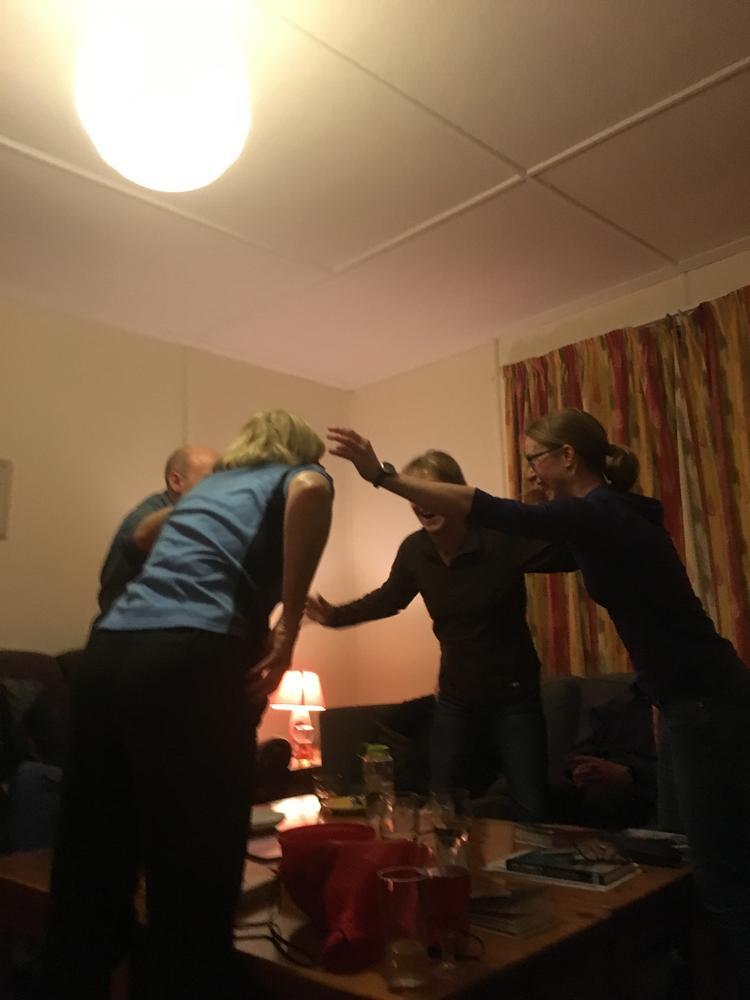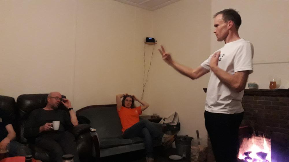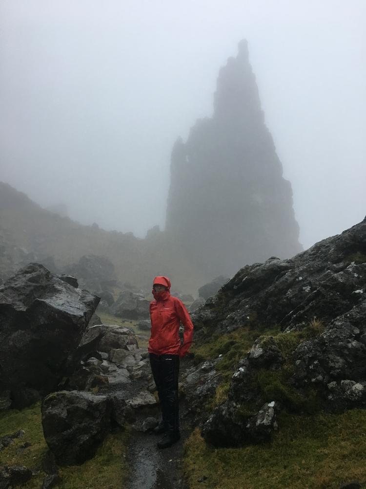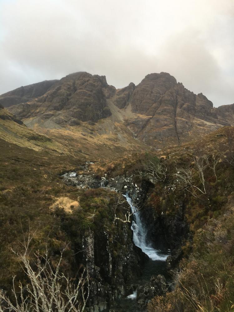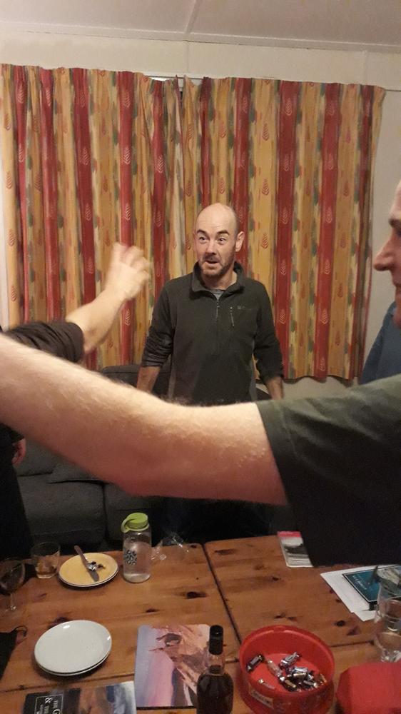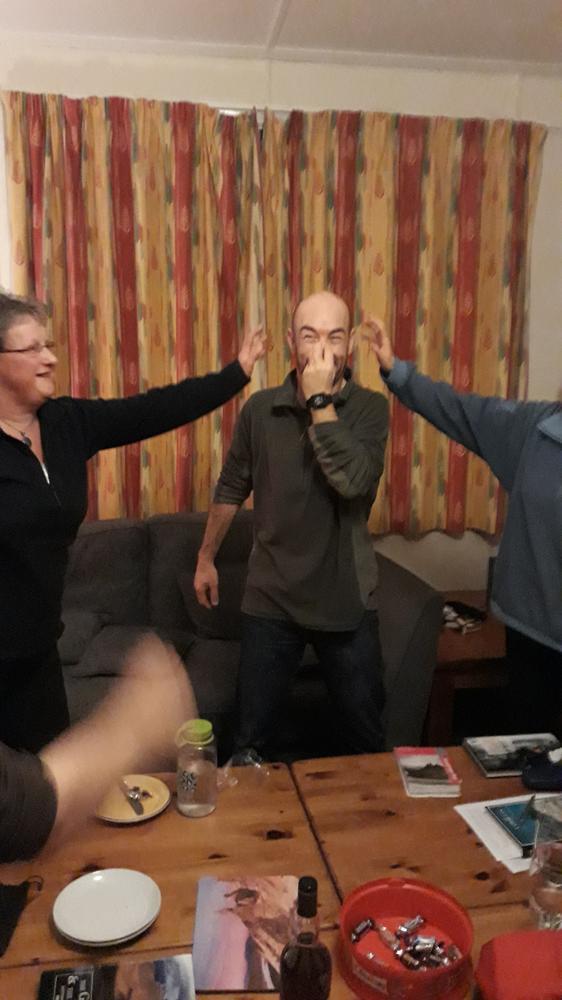 The following morning there was a lot of gazing out the window at the weather, minging was the verdict. Heavy showers and windy but there was only so much coffee you can drink and so in dribs and drabs people set off for various activities. Mike and Fiona took a gamble and were the only folk to actually attempt a hill and went off up the Graham directly behind the bunkhouse, myself, Claire and Neil did a run over to the fairy pools where despite the weather there must have been 50 cars parked (why are these so popular?!). Gillian, Fiona M, Kenny, David, Chrisx2 went up a Marilyn called Roineval. Anne, Cathy and Fiona C went for a coast walk near Portree. Clare A joined us that evening having driven up from doing a hill near Crianlarich and arrived in plenty time for the excellent feast that was served up that night. After dinner we all retired to the lounge where David took on the role of entertainment manager and we played a game that involved holding your nose when someone pointed at you while the two people either side of you had to cup your ears. Now on the face of it this all sounds very simple but as more drink was consumed, the heat in the room grew to sauna levels and the game speeded up it turned very competitive and got very very funny, this could become an EMC favourite! After that we moved onto that old favourite charades, I think it’s safe to say that charades is not my forte and our team was soundly beaten.