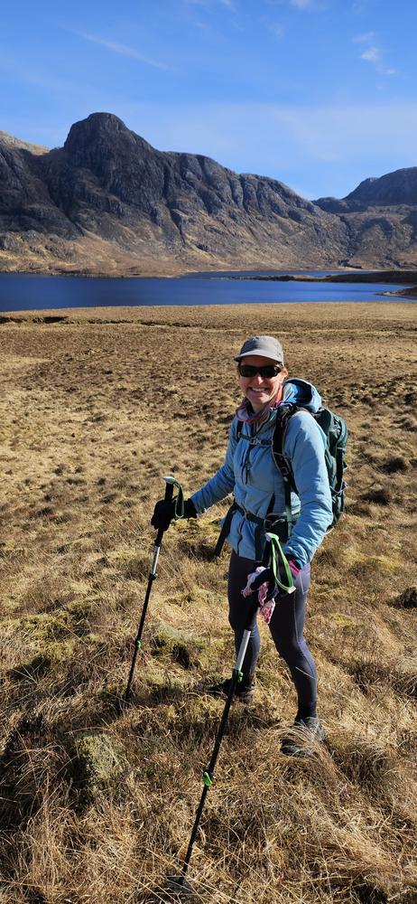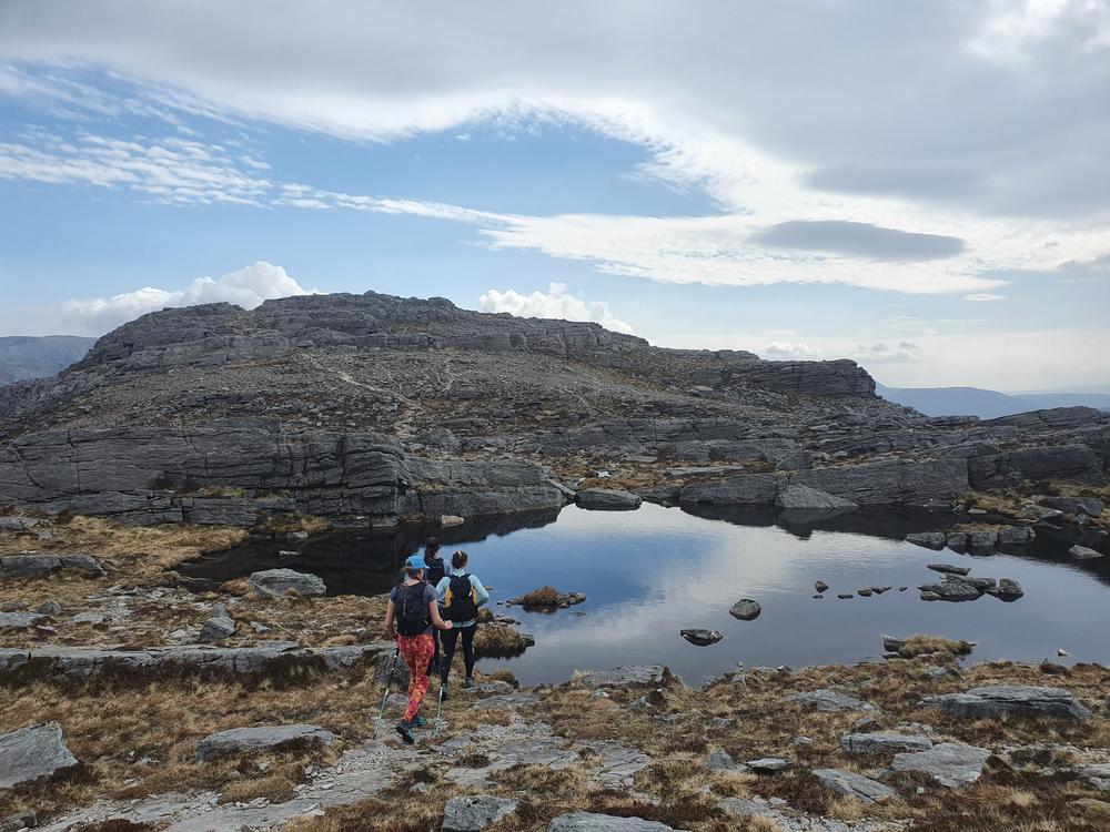 Alison and the Fionas did a traverse of Suilven. Initial plans had involved a link-up with Canisp, but the approach took much longer than expected, some of the scrambling was a bit more involved than anticipated and to top it up Fiona M forgot her walking pole halfway up Suilven and had to return to get it. They were then very glad for a lift back from Lochinver by Kenny who had been up Canisp earlier in the day.