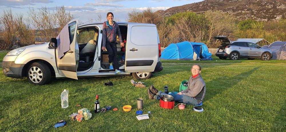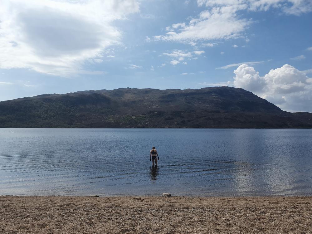 Rhi, Nicola, Sophie and myself did a walk with a bit of running on Quinag, too. My legs were very tired, so Allan’s observed “you were flying!” was certainly a blatant exaggeration. On the hill we bumped into Glen, the dog (plus his owner). I had met Glen back in 2018 when we were both bagging Munros. Now we’ve both completed and are climbing up Corbetts! After Quinag we had a glorious but cold dip in Loch Assynt, followed by chilling and tea drinking back at the hut.