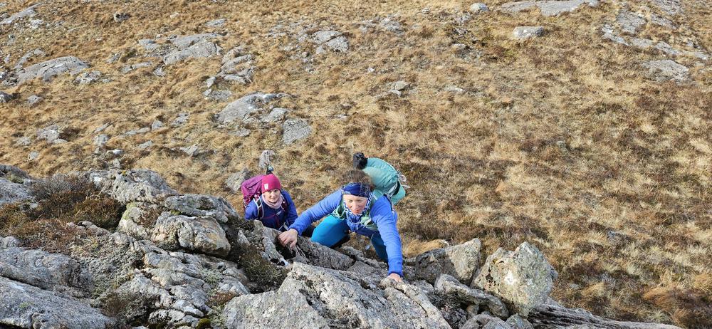 On Saturday, it was still dry but the sun was – at least initially – a bit more hesitant. Claire trotted along the coast from Ardmair, didn’t go up Isle Martin Buttress but did go up the west ridge onto Ben More Coigach and along the tops to the Stac Polly car park to meet Anna and Steve who were climbing there lots of fun routes. Doug and Helen had a long day, also on Stac Polly, where they did a grassy November Groove and Summer Isles Arete direct with Helen; Helen led the short vicious corner crack and they spotted an adder! The evening light was glorious and it was nearly 10pm by the time Doug was back at the hut.