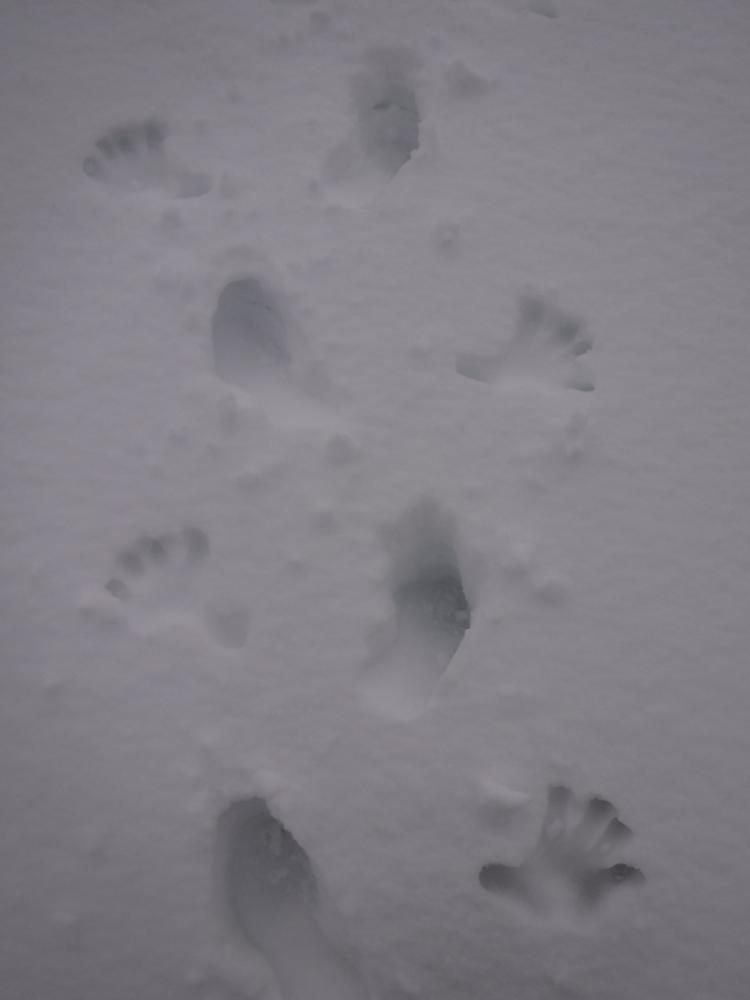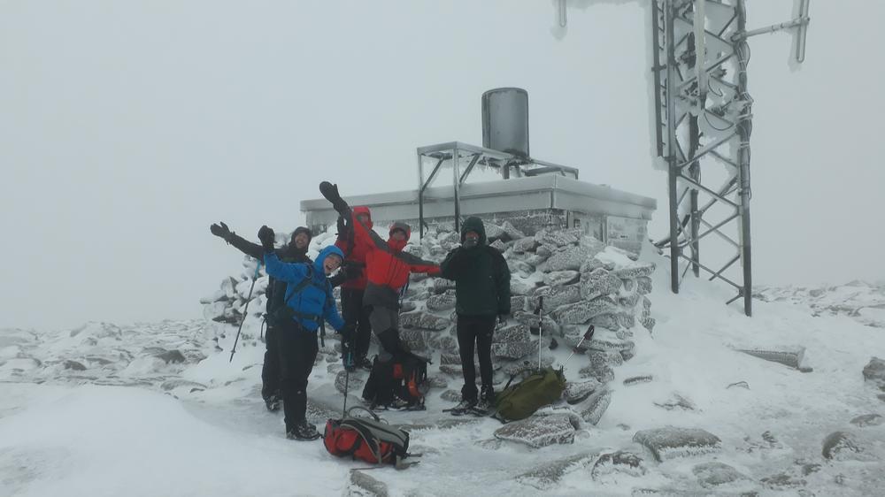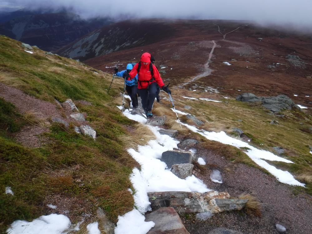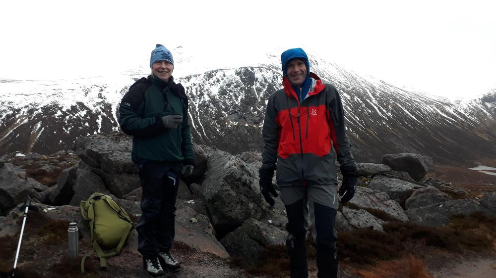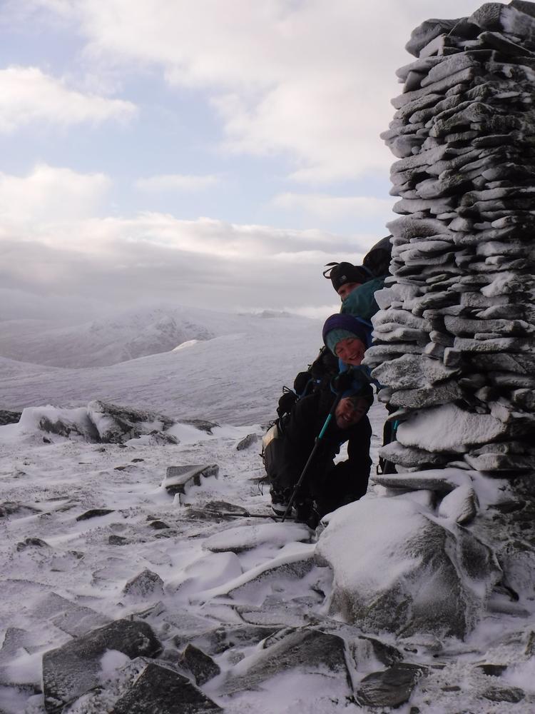 On Saturday the forecast was pretty poor and there were a few naysayers but the majority of the group (Claire, Anne, Alan, Chris R, Martha, Chris W and local Fiona M) went to the Sugarbowl carpark, set a fast pace up the Bynack More path only for a huge side-swipe of wind on the ridge up from the track. We sought refuge on more than one occasion when reduced to a crawl, but it was never bad enough to actually turn back or shorten the walk. We enjoyed a good view of Loch Avon from the Saddle and followed some curious tracks up to Cairn Gorm: a complete set of hand and footprints! Presumably from a long-armed person rather than a well-equipped gorilla. We experienced an eerie silence at the top of the mountain: normally hooching with people at all times of year, the funicular is currently out of action for the foreseeable and it was a shell of a place. The new snow machine was merrily churning away at the bottom of the hill though!