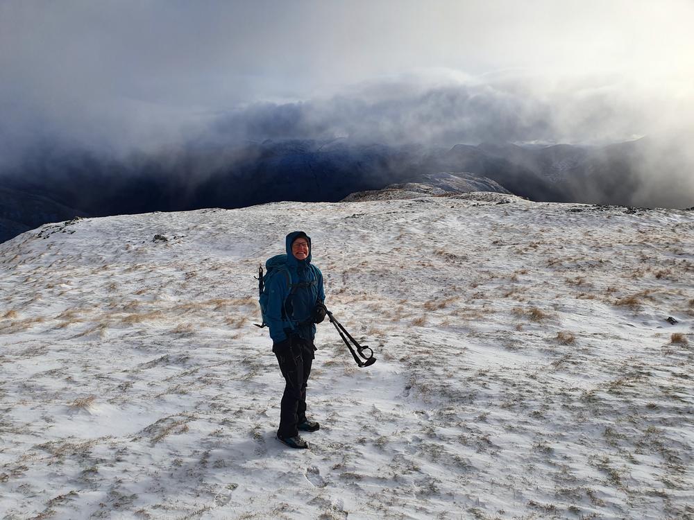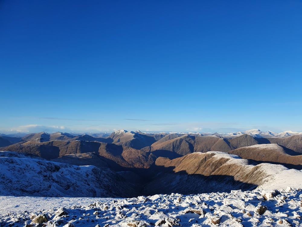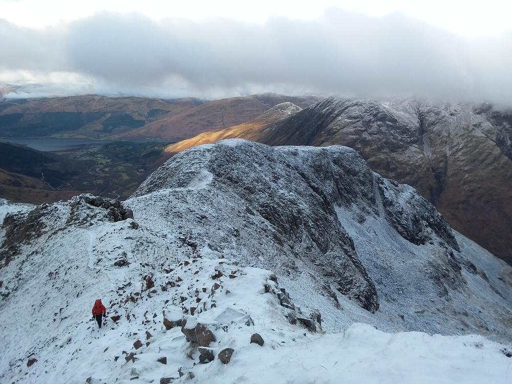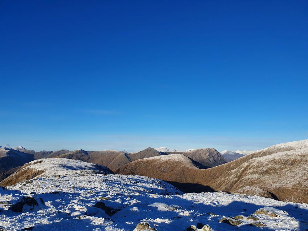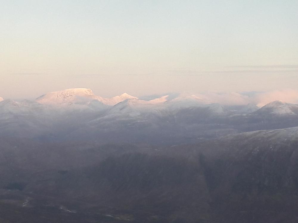 Mike and Fiona headed up Stob Ban and Mullach nan Coirean from the South. Starting above Fort William they slipped and slithered along the West Highland Way for 6km or so then up the crazy steep SW ridge of Stob Ban. Mike was muttering about having been dragged on a Sufferfest not approving of Fiona’s alternative route. Once the slog uphill was over they were rewarded with stunning 360 degree views.