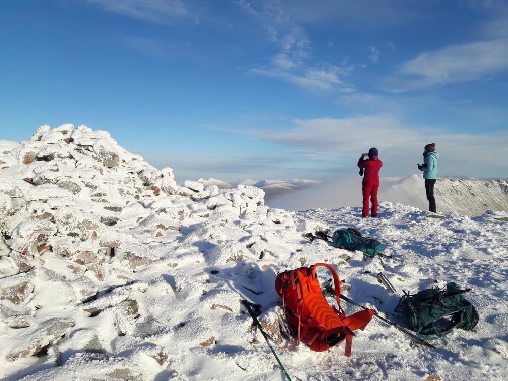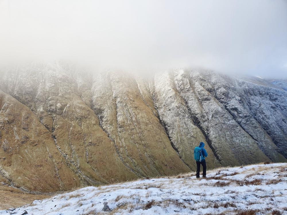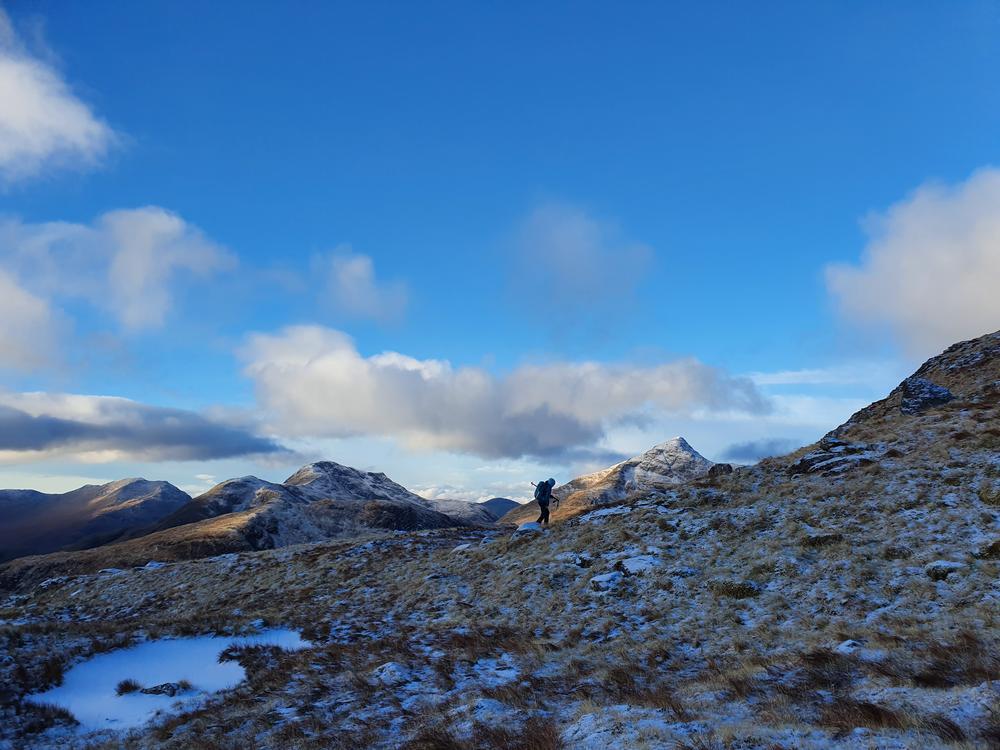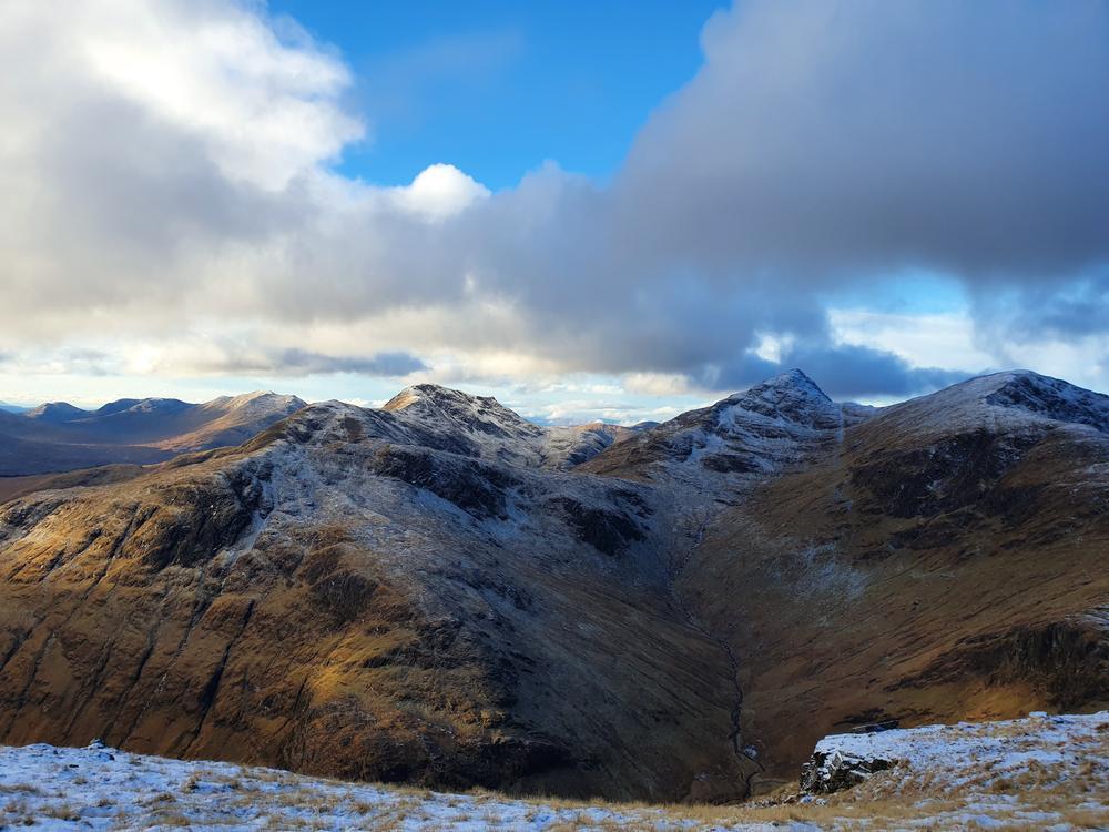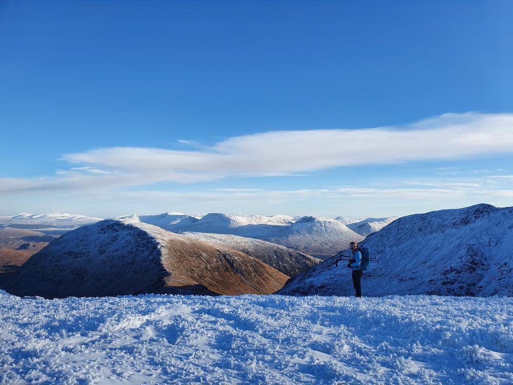Mike and Fiona headed up Stob Ban and Mullach nan Coirean from the South. Starting above Fort William they slipped and slithered along the West Highland Way for 6km or so then up the crazy steep SW ridge of Stob Ban. Mike was muttering about having been dragged on a Sufferfest not approving of Fiona’s alternative route. Once the slog uphill was over they were rewarded with stunning 360 degree views.