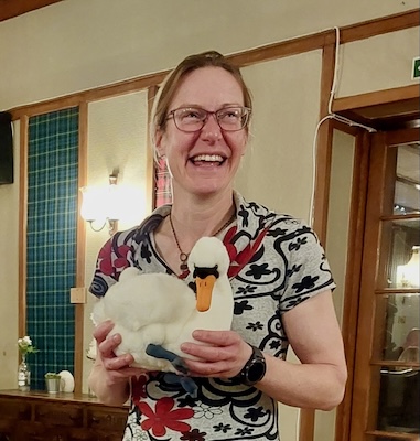 Claire Hopkins (EMC president 2019-22, pictured here) came up with the idea of the Poulet d’Or when listening to a talk by a former winner of the Piolet d’Or – the Golden Ice Axe or prestigious international “Oscars of mountaineering”. Inspired by an amusing event which happened to a club member that year (and discussed in good humour between many others via the regular Virtual Pub calls that year) the Poulet d’Or – a suitably irreverent nod to the accolade of high-altitude achievement – became a cuddly toy swan and is awarded each year to a club member for doing something truly daft.